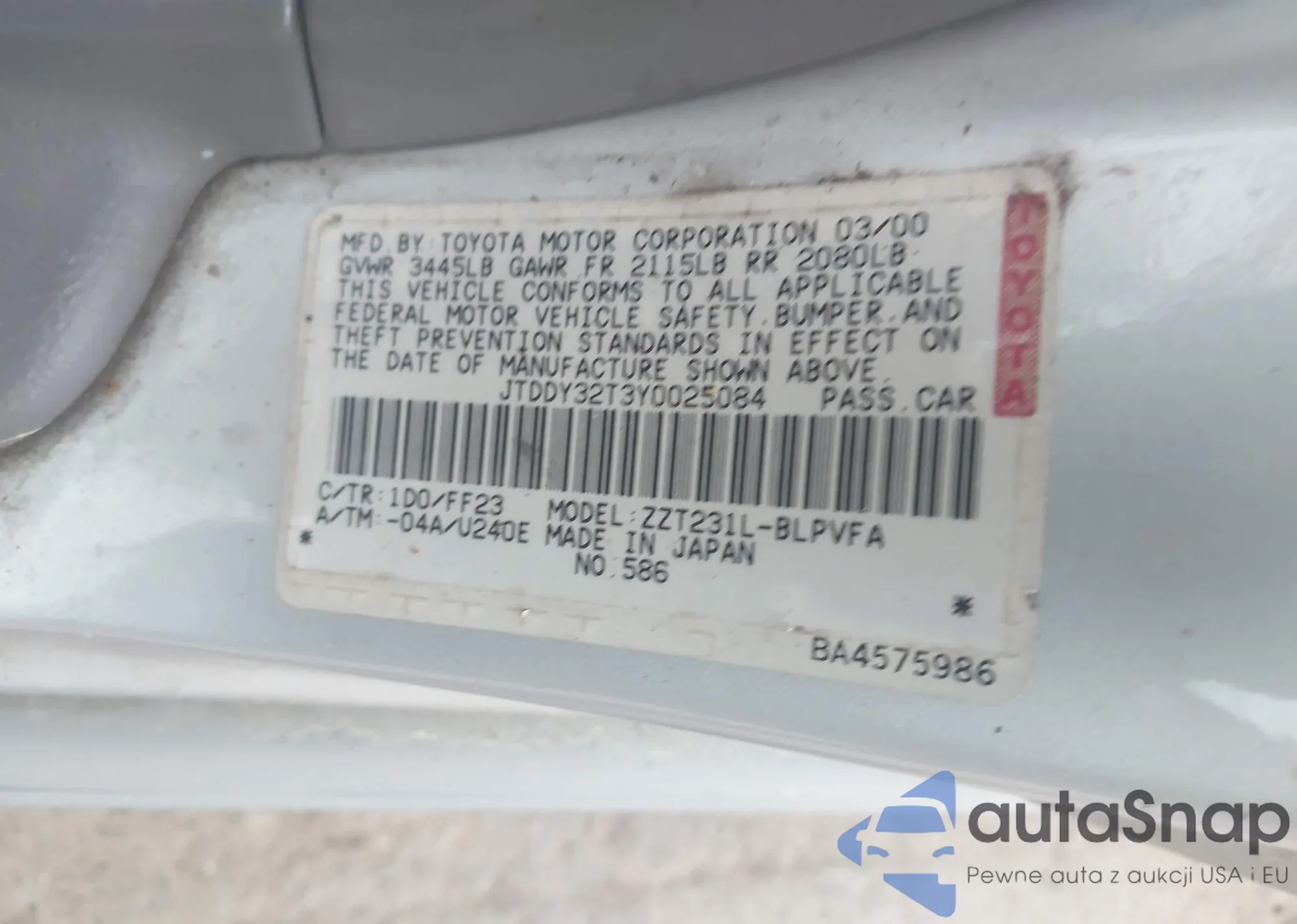LOT: 41920668 VIN: JTDDY32T3Y0025084