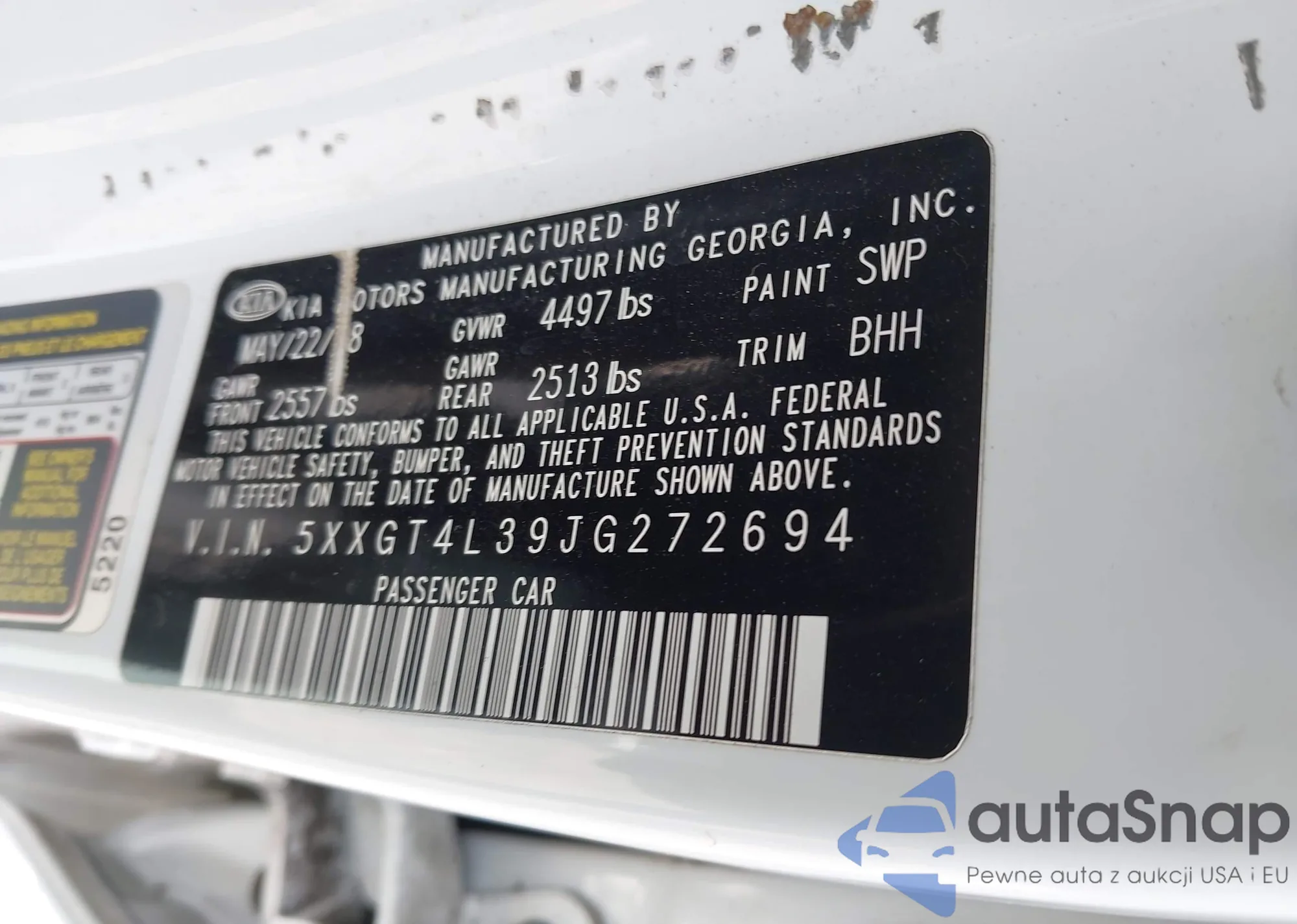 LOT: 42155363 VIN: 5XXGT4L39JG272694