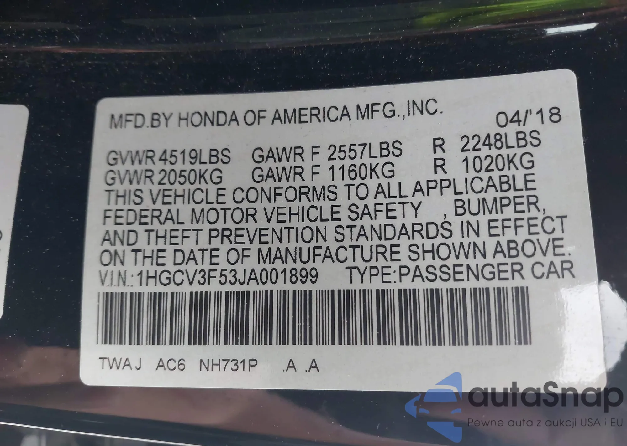 LOT: 42189945 VIN: 1HGCV3F53JA001899