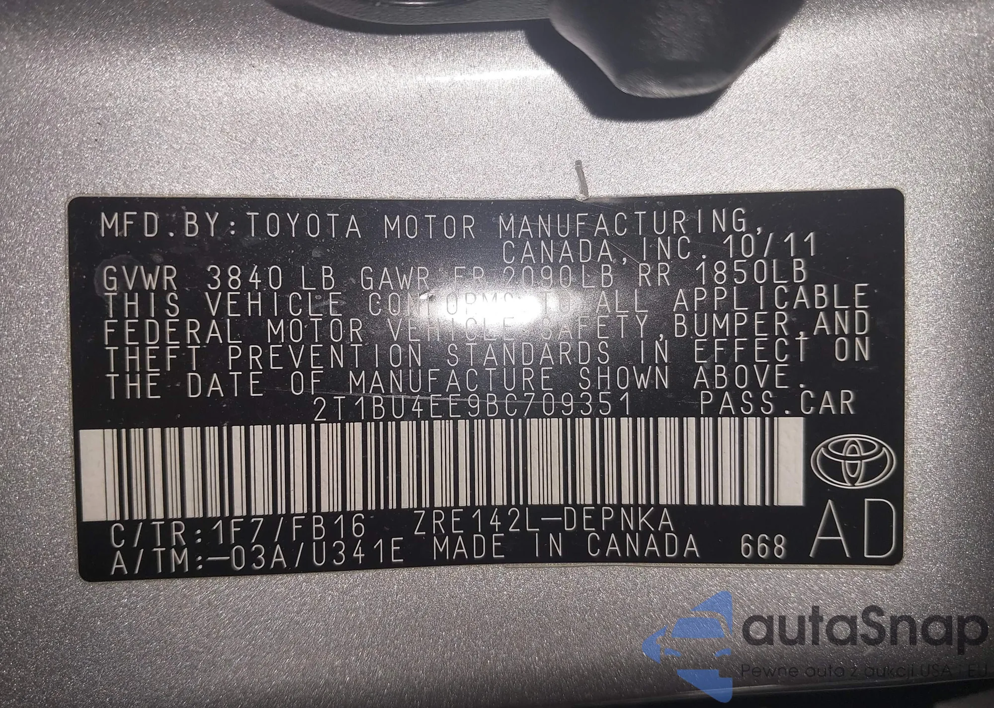 • VIN 2T1BU4EE9BC709351