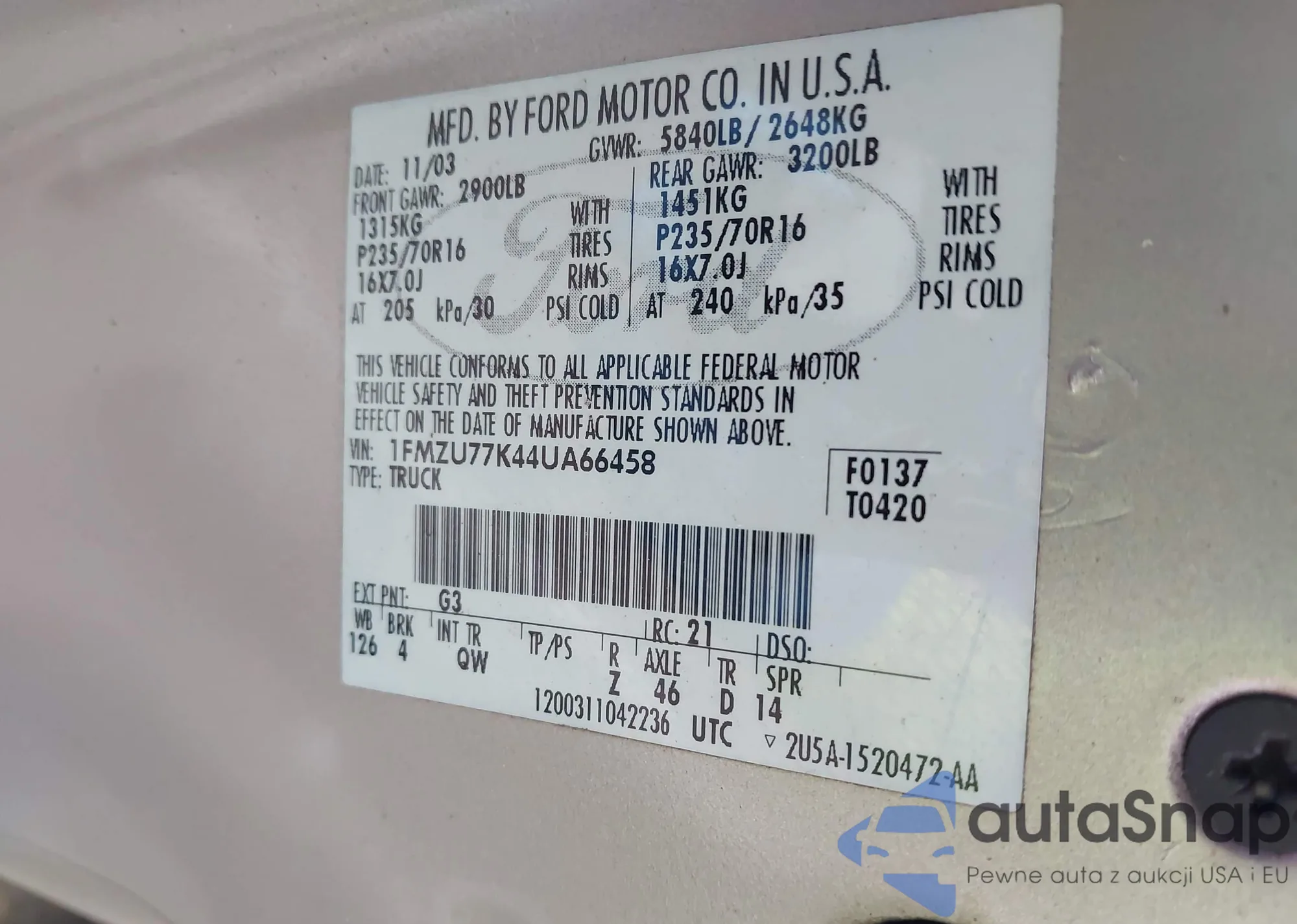 • VIN 1FMZU77K44UA66458