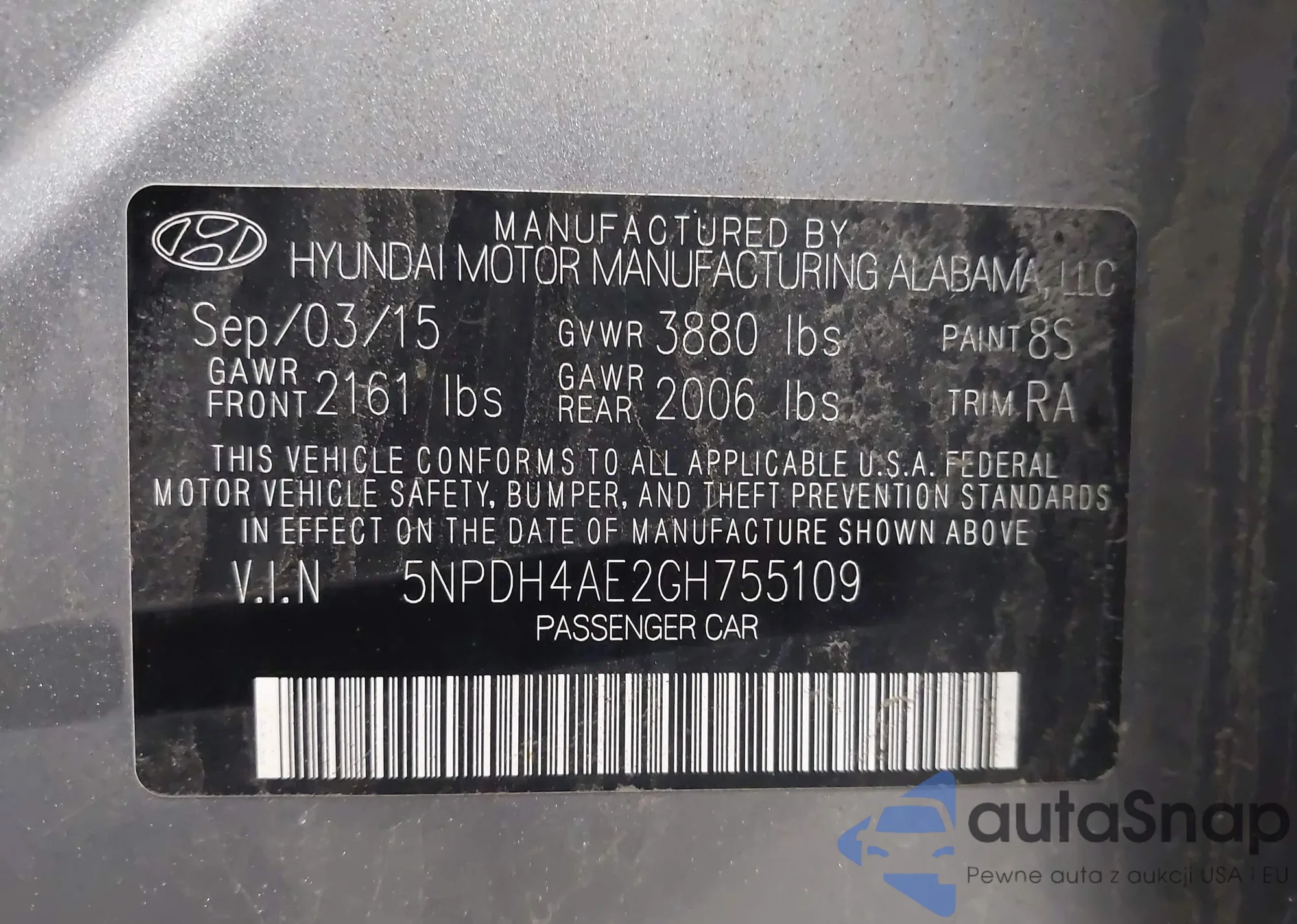 LOT: 41935952 VIN: 5NPDH4AE2GH755109