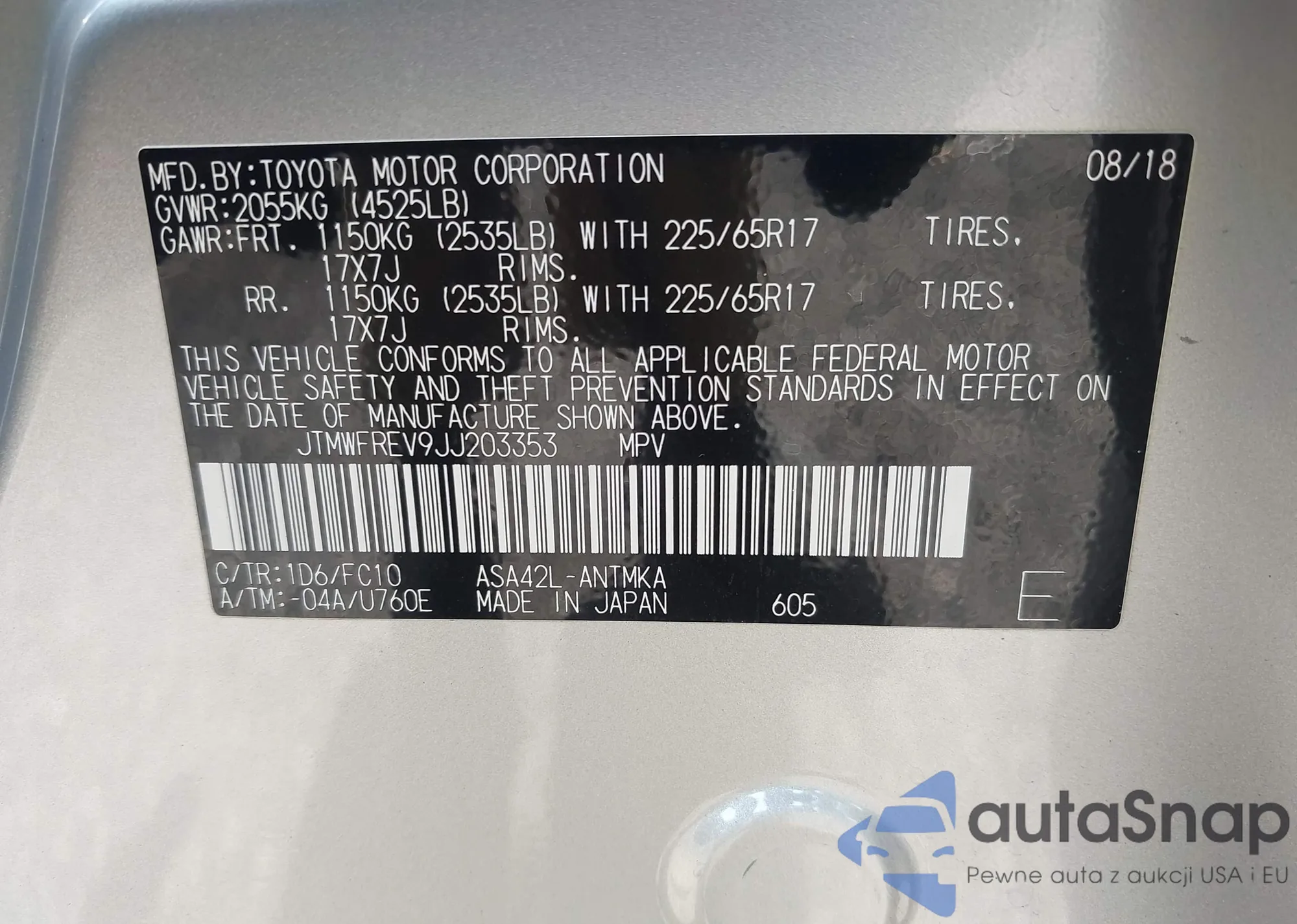LOT: 42129995 VIN: JTMWFREV9JJ203353