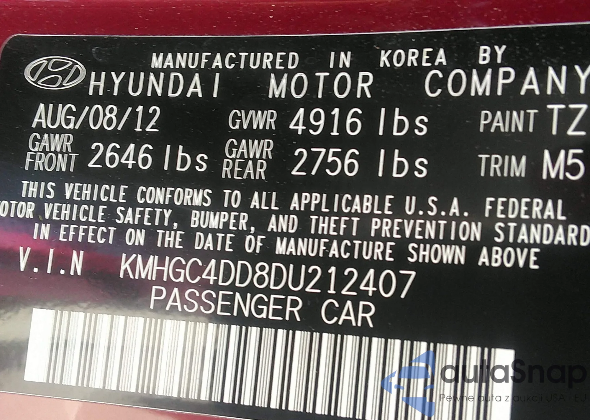 LOT: 42237644 VIN: KMHGC4DD8DU212407