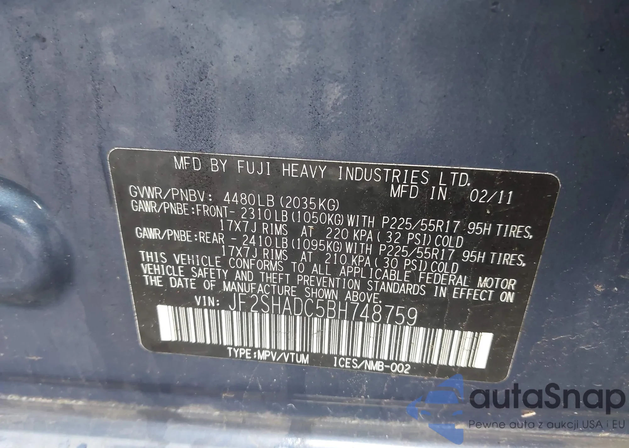 LOT: 42266329 VIN: JF2SHADC5BH748759