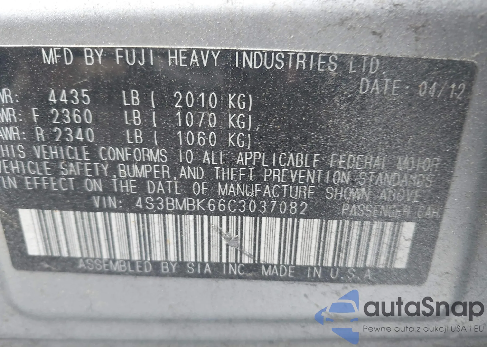 • VIN 4S3BMBK66C3037082