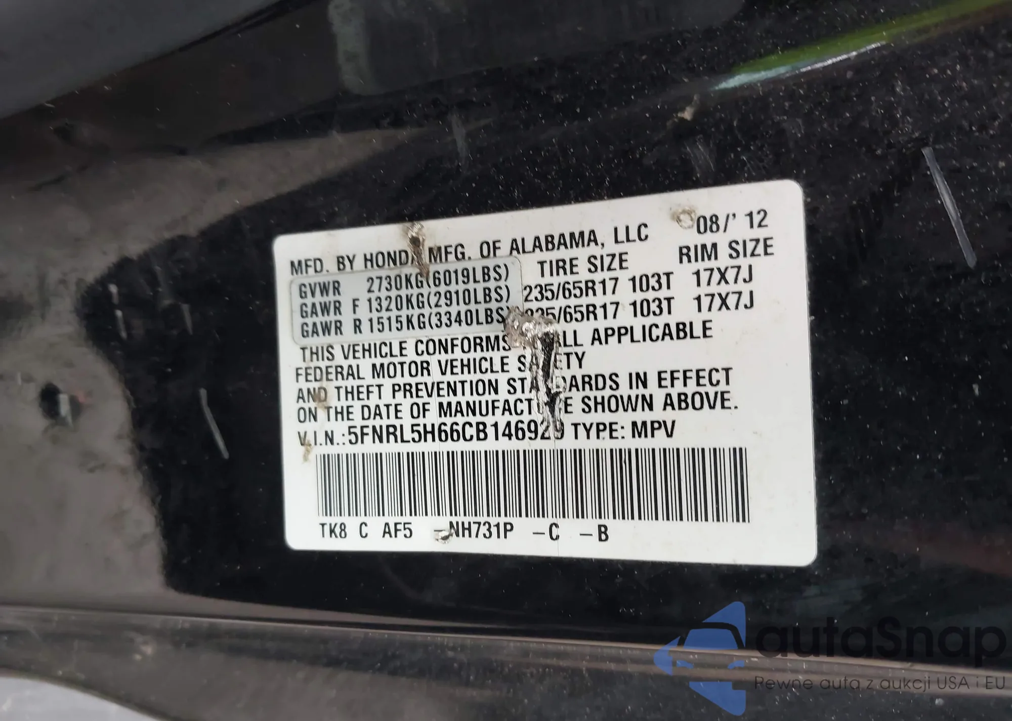 LOT: 41996600 VIN: 2HGFE2F57PH558638
