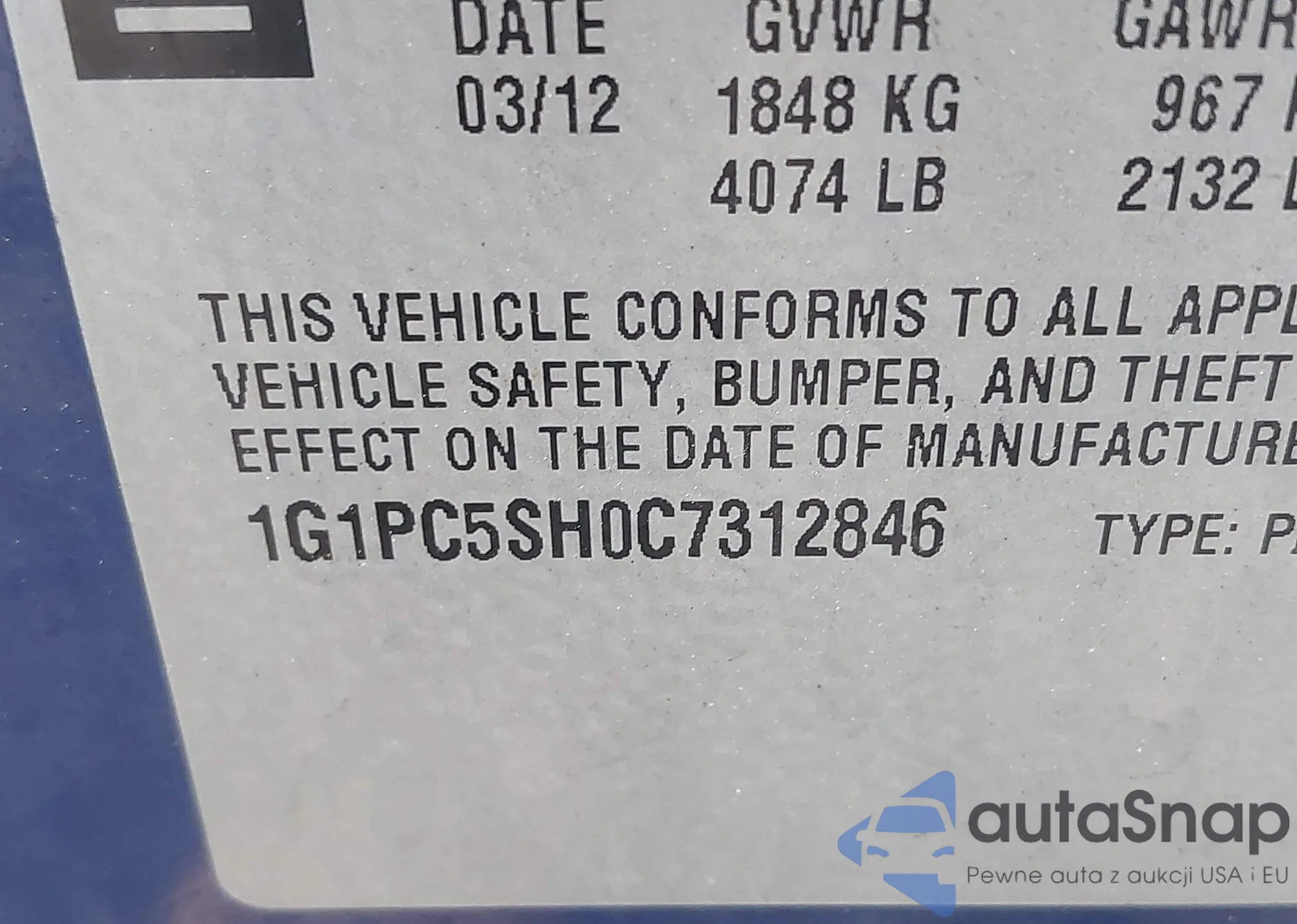 LOT: 42048330 VIN: 1G1PC5SH0C7312846