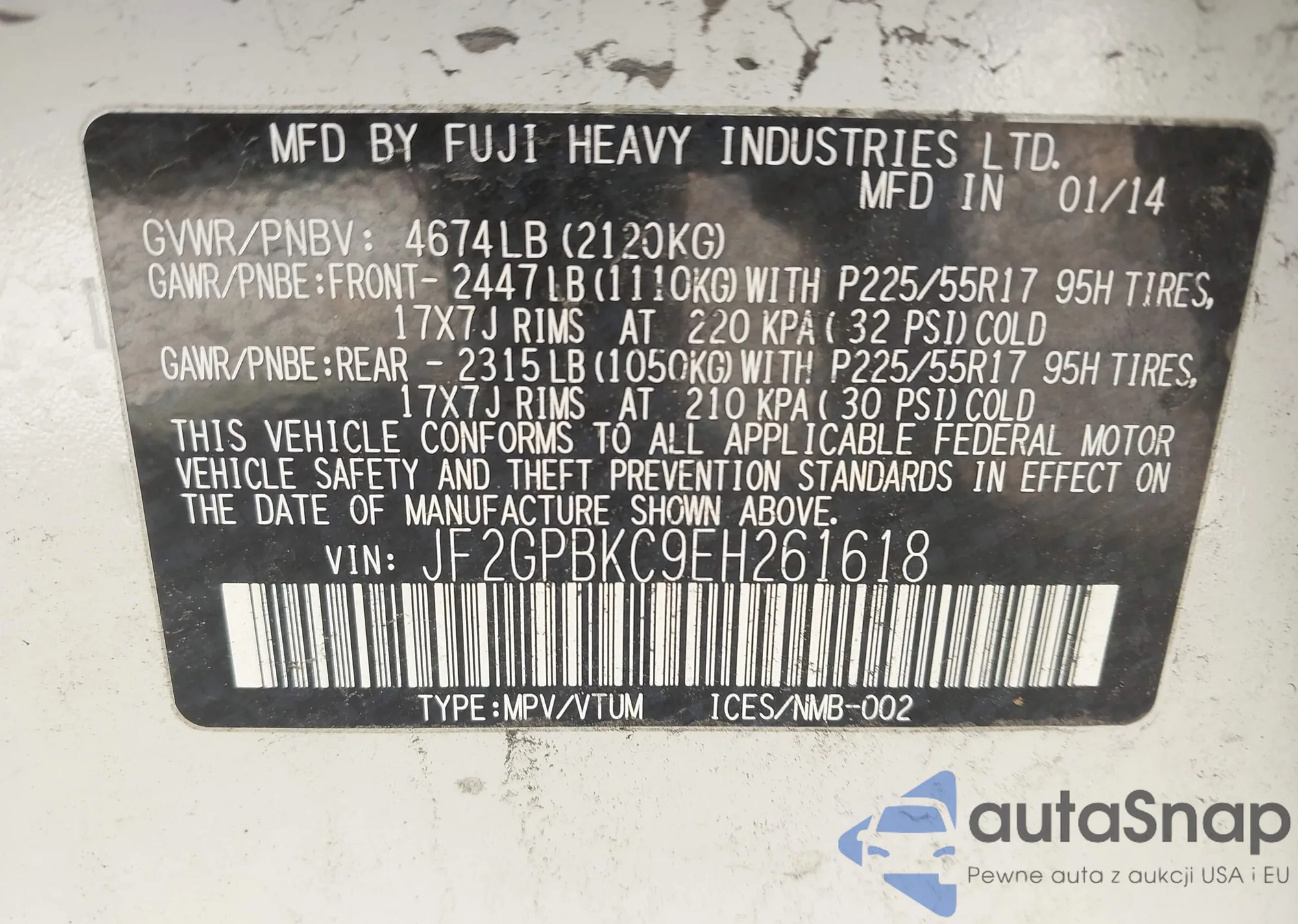 LOT: 41902452 VIN: JF2GPBKC9EH261618