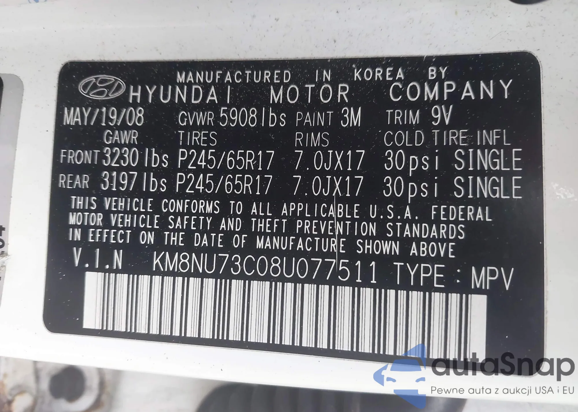 LOT: 42213972 VIN: KM8NU73C08U077511