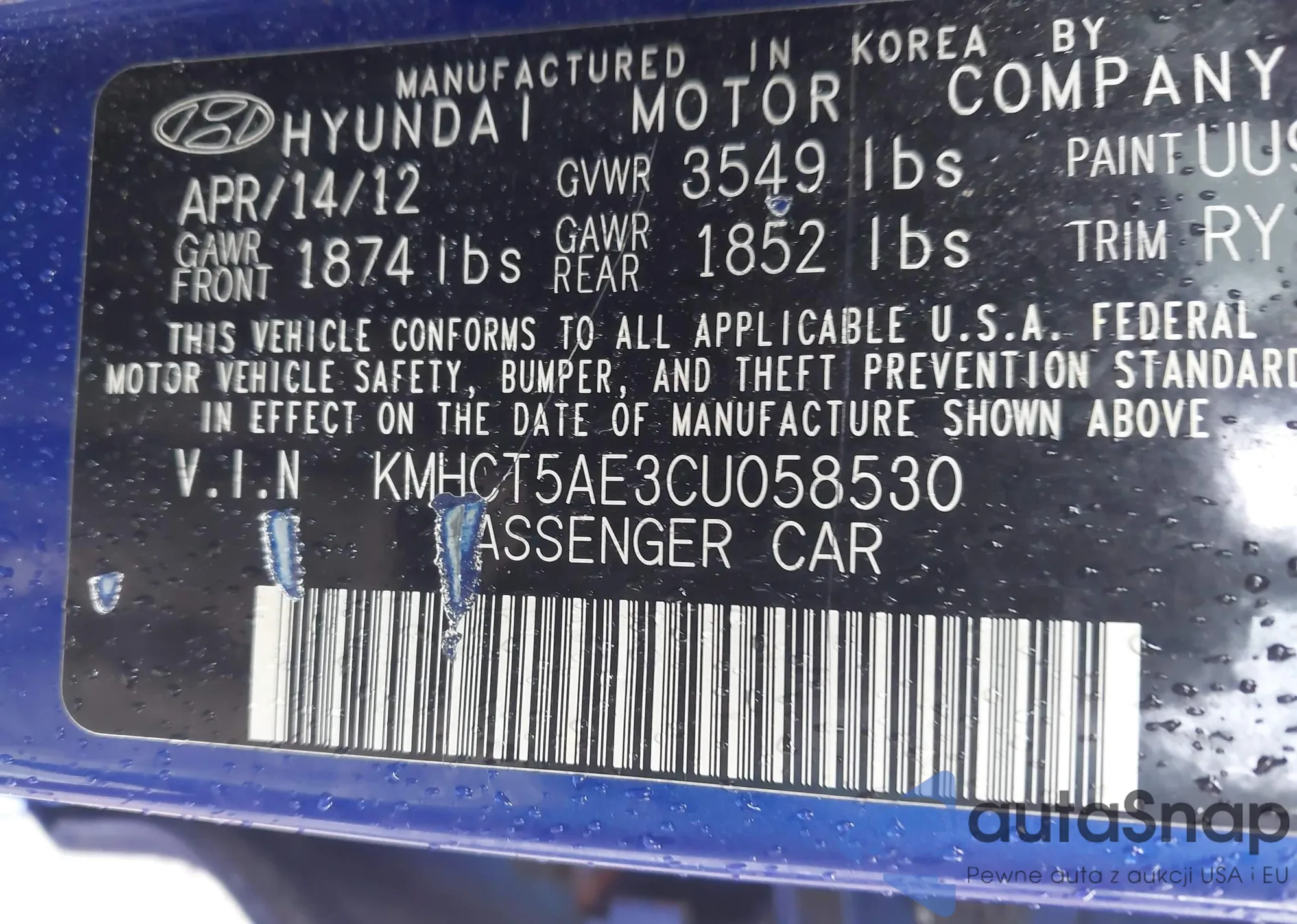 LOT: 42190659 VIN: KMHCT5AE3CU058530