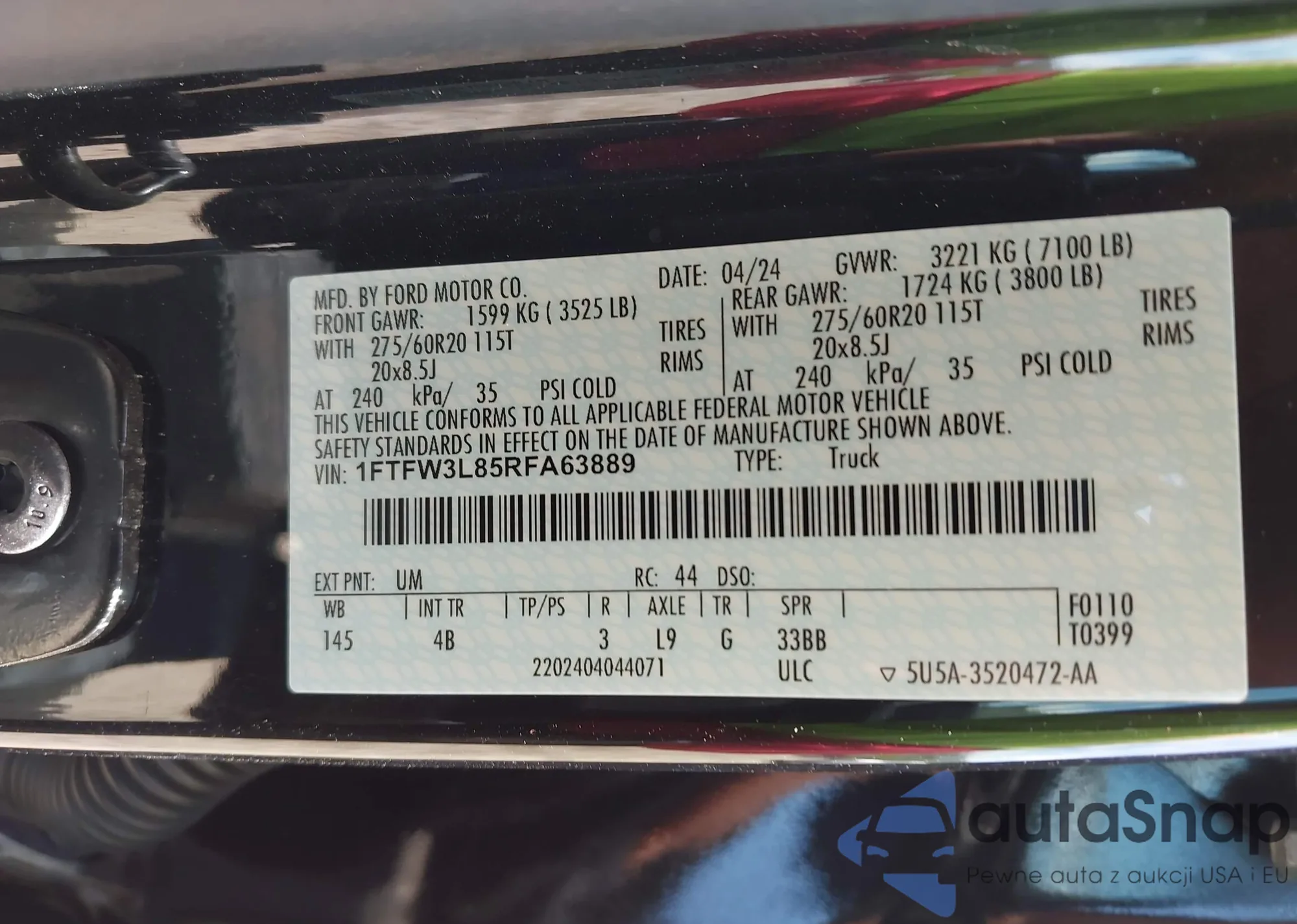 • VIN 1FTFW3L85RFA63889