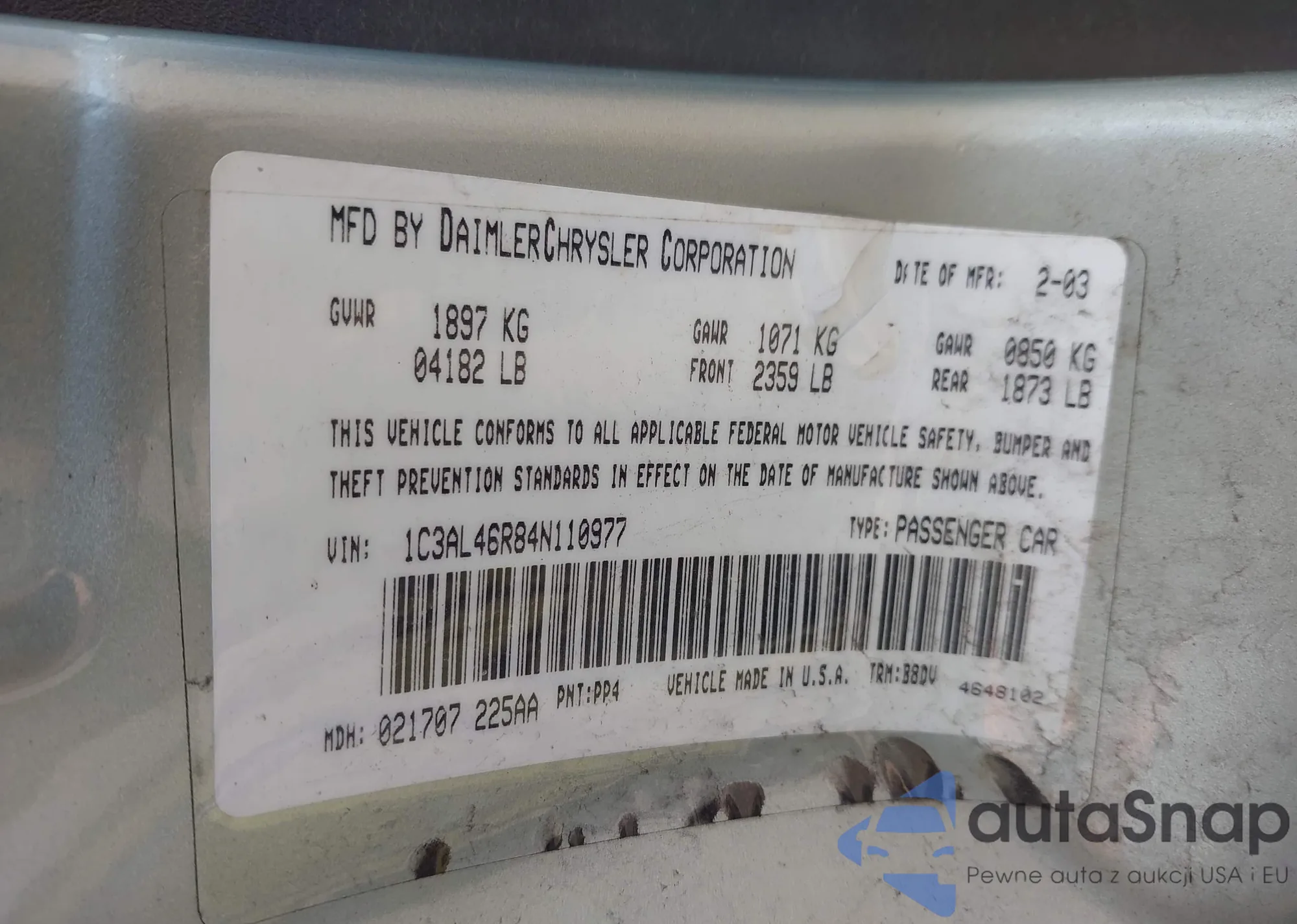 LOT: 42401282 VIN: 1C3AL46R84N110977