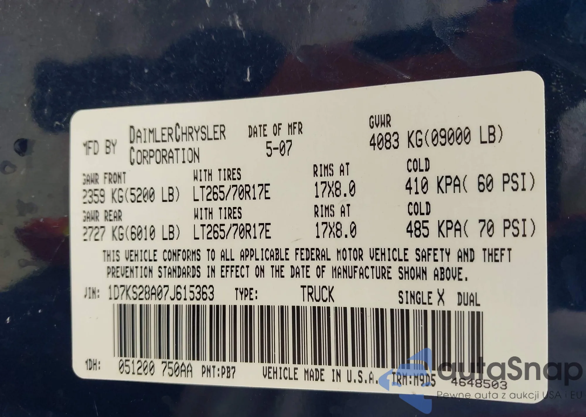 • VIN 1D7KS28A07J615363