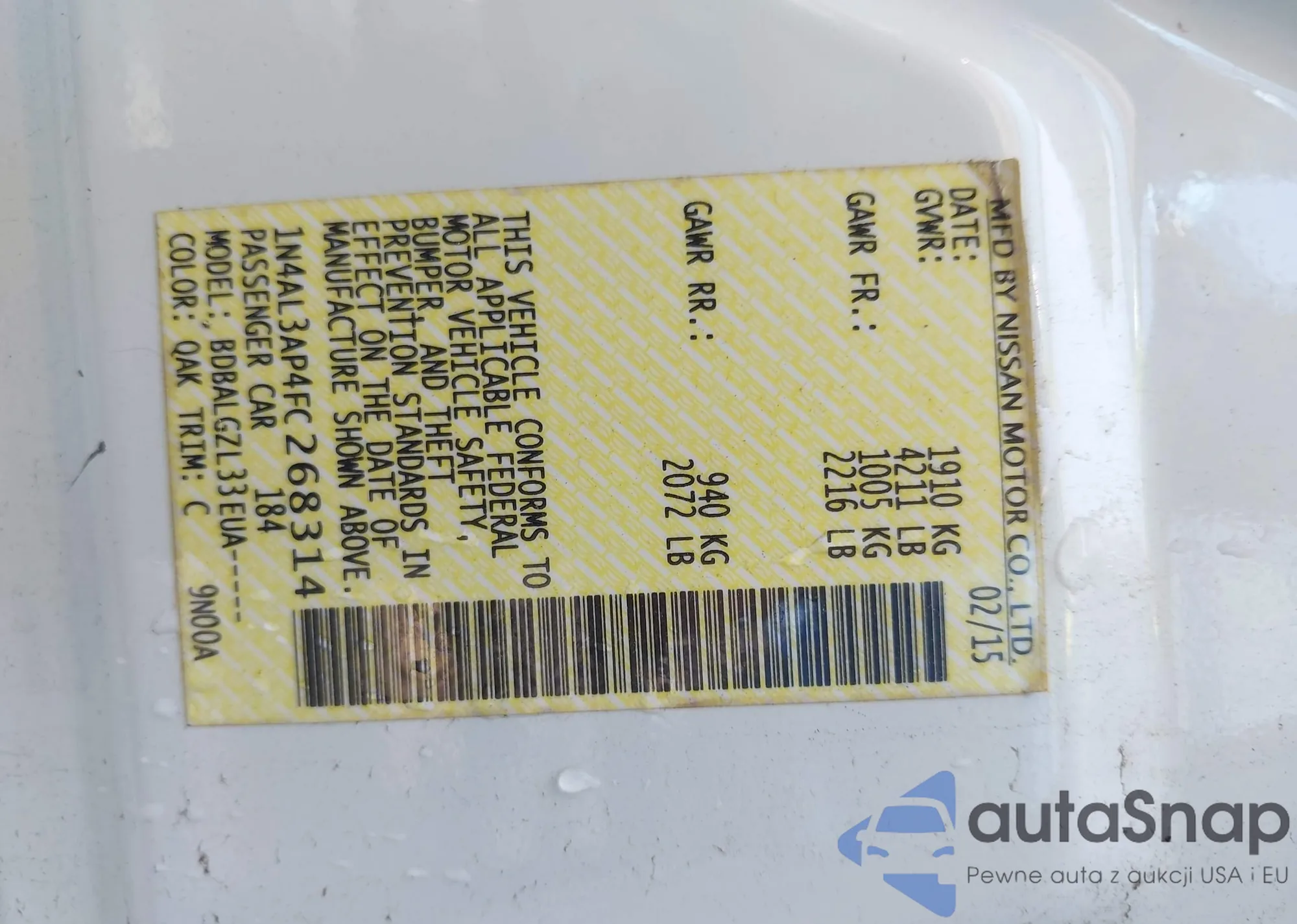 LOT: 42388359 VIN: 1N4AL3AP4FC268314