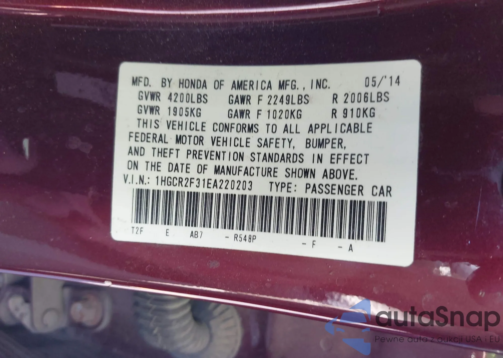 LOT: 42332136 VIN: 1HGCR2F31EA220203