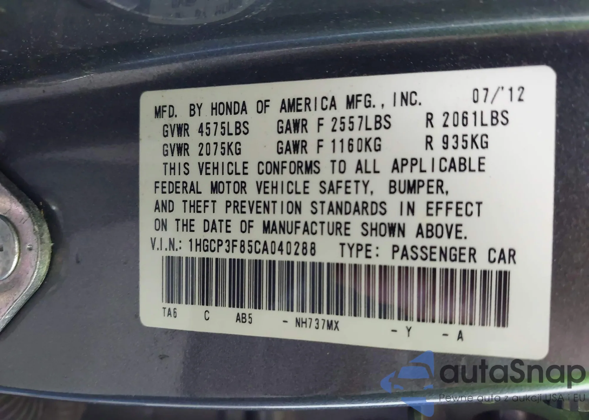 LOT: 42370461 VIN: 1HGCP3F85CA040288