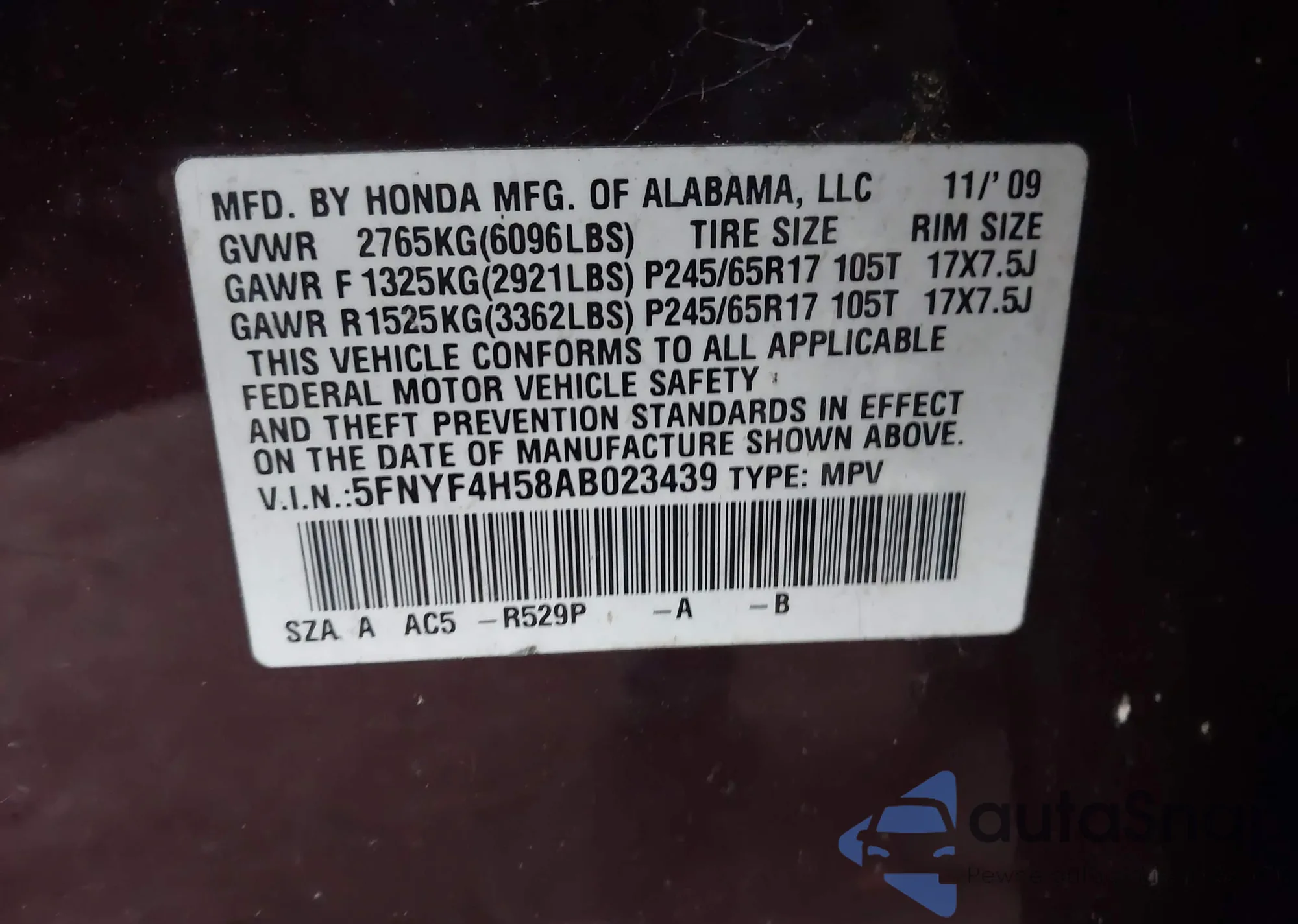 • VIN 5FNYF4H58AB023439