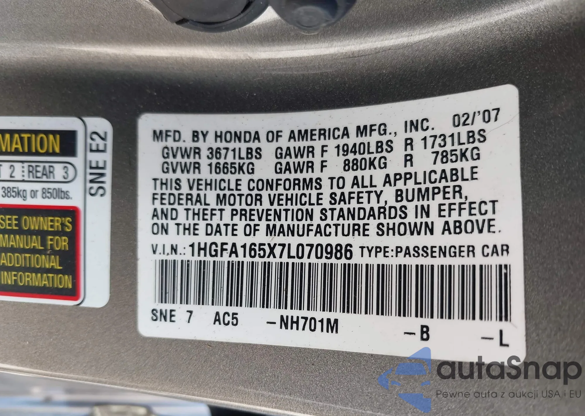 LOT: 42117859 VIN: 1HGFA165X7L070986