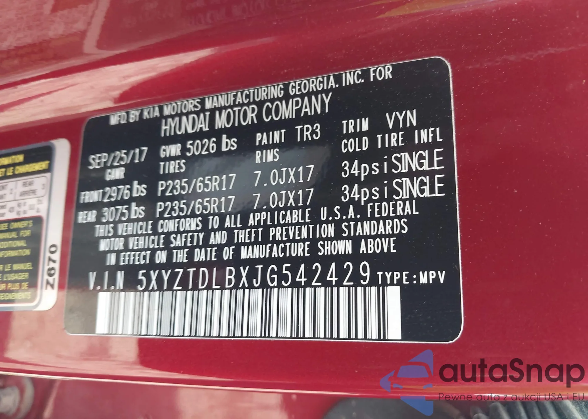 • VIN 5XYZTDLBXJG542429