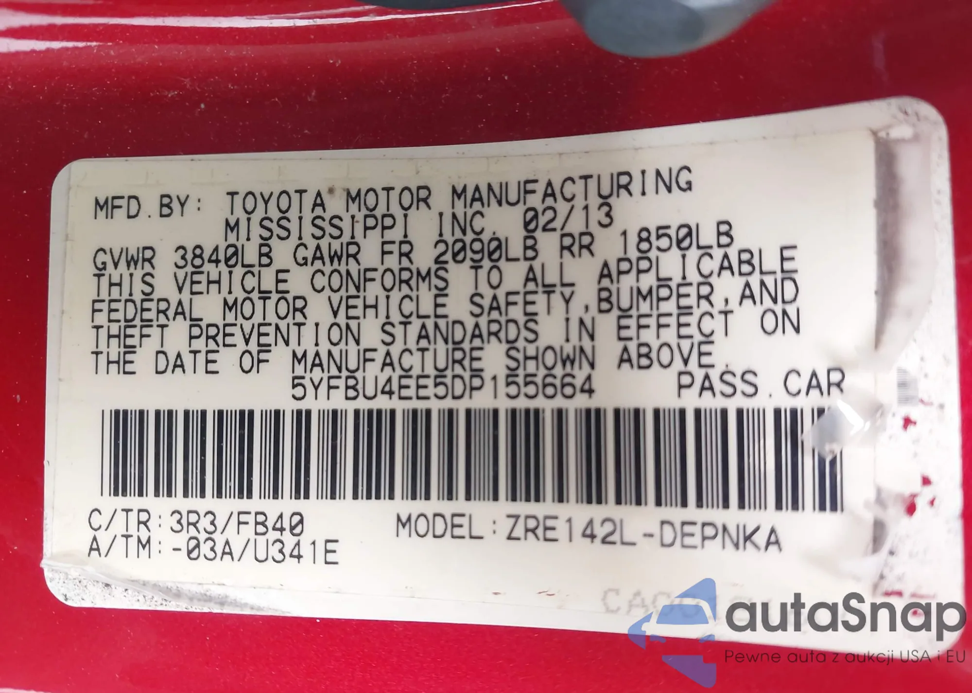 LOT: 42384277 VIN: 5YFBU4EE5DP155664
