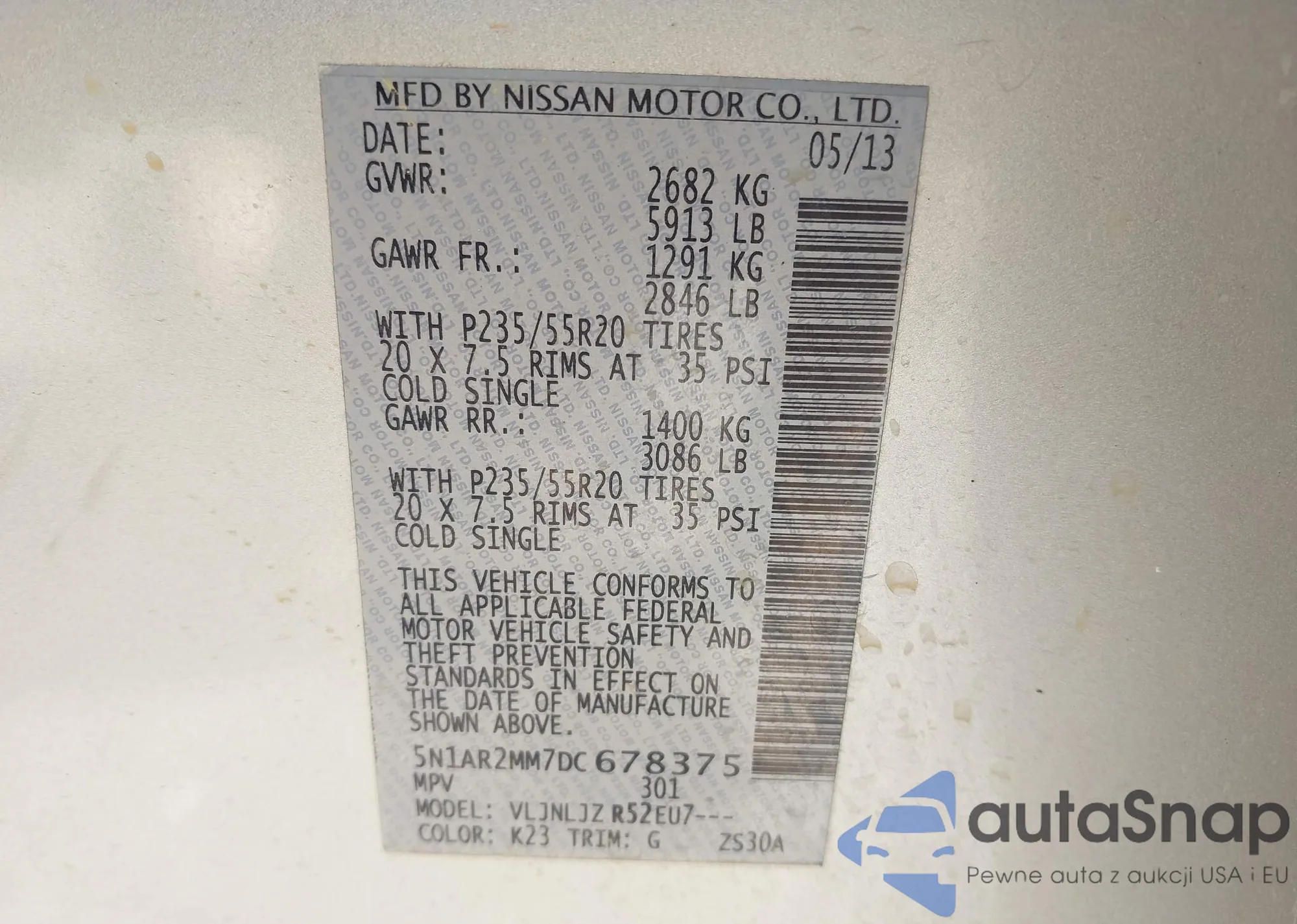 LOT: 42318076 VIN: 5N1AR2MM7DC678375