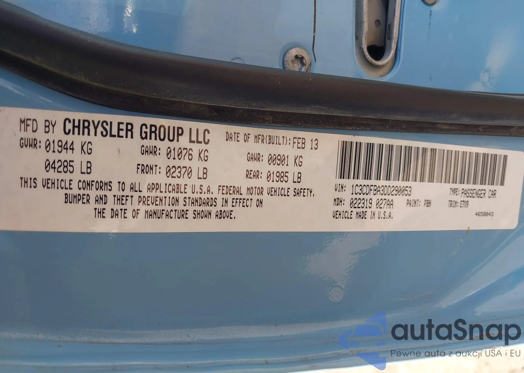 • VIN 1C3CDFBA3DD290053