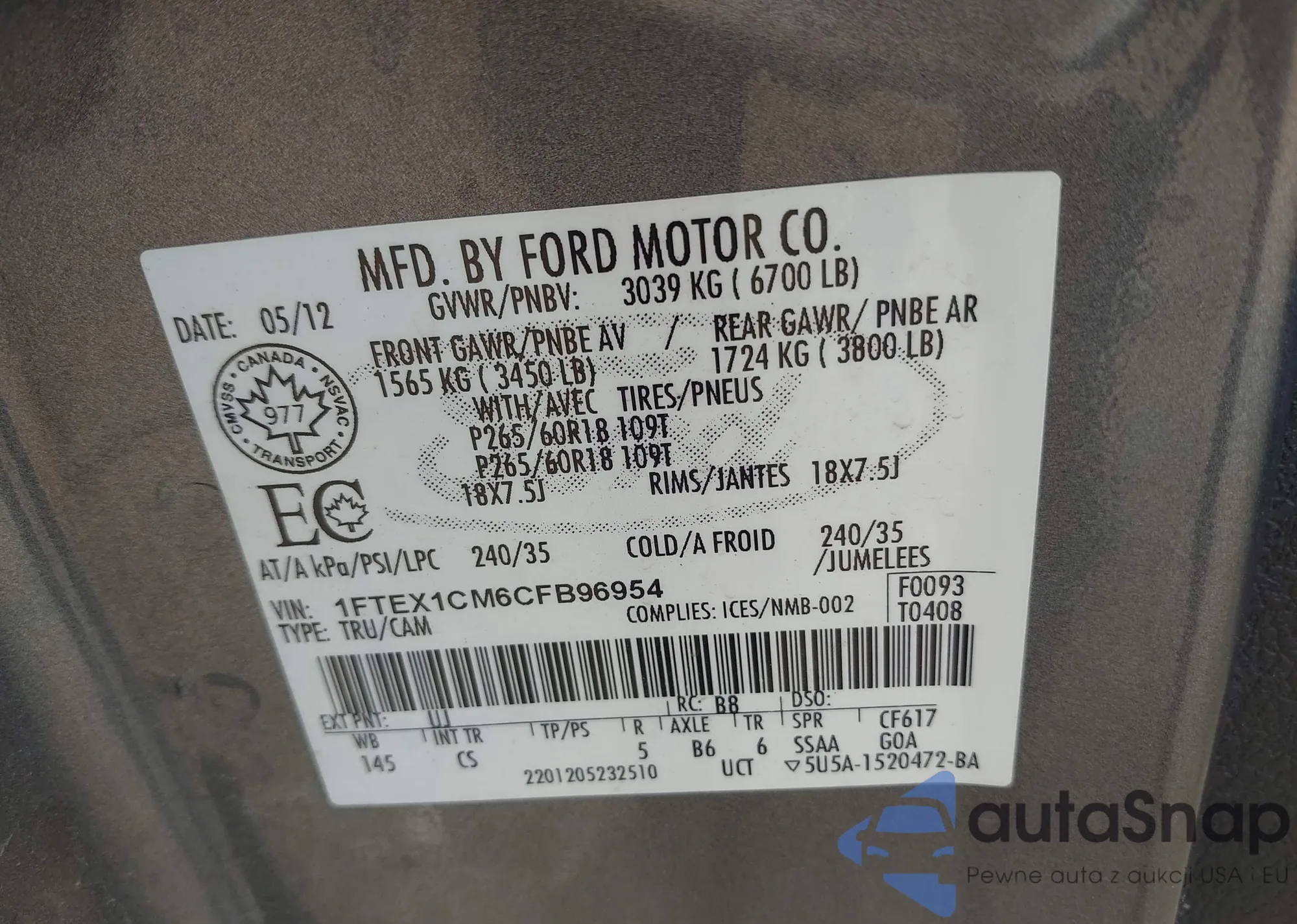 LOT: 42247914 VIN: 1FTEX1CM6CFB96954