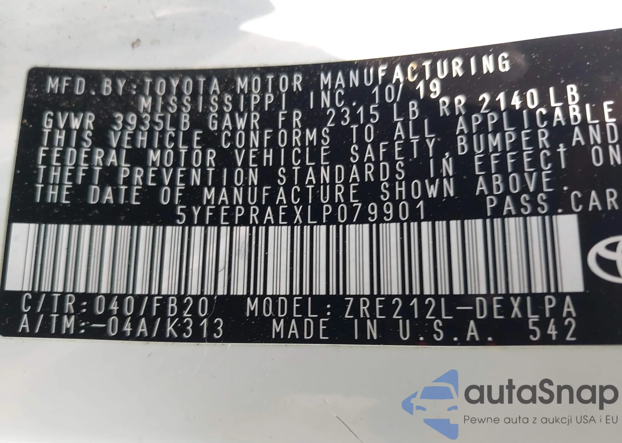LOT: 42388609 VIN: 5YFEPRAEXLP079901