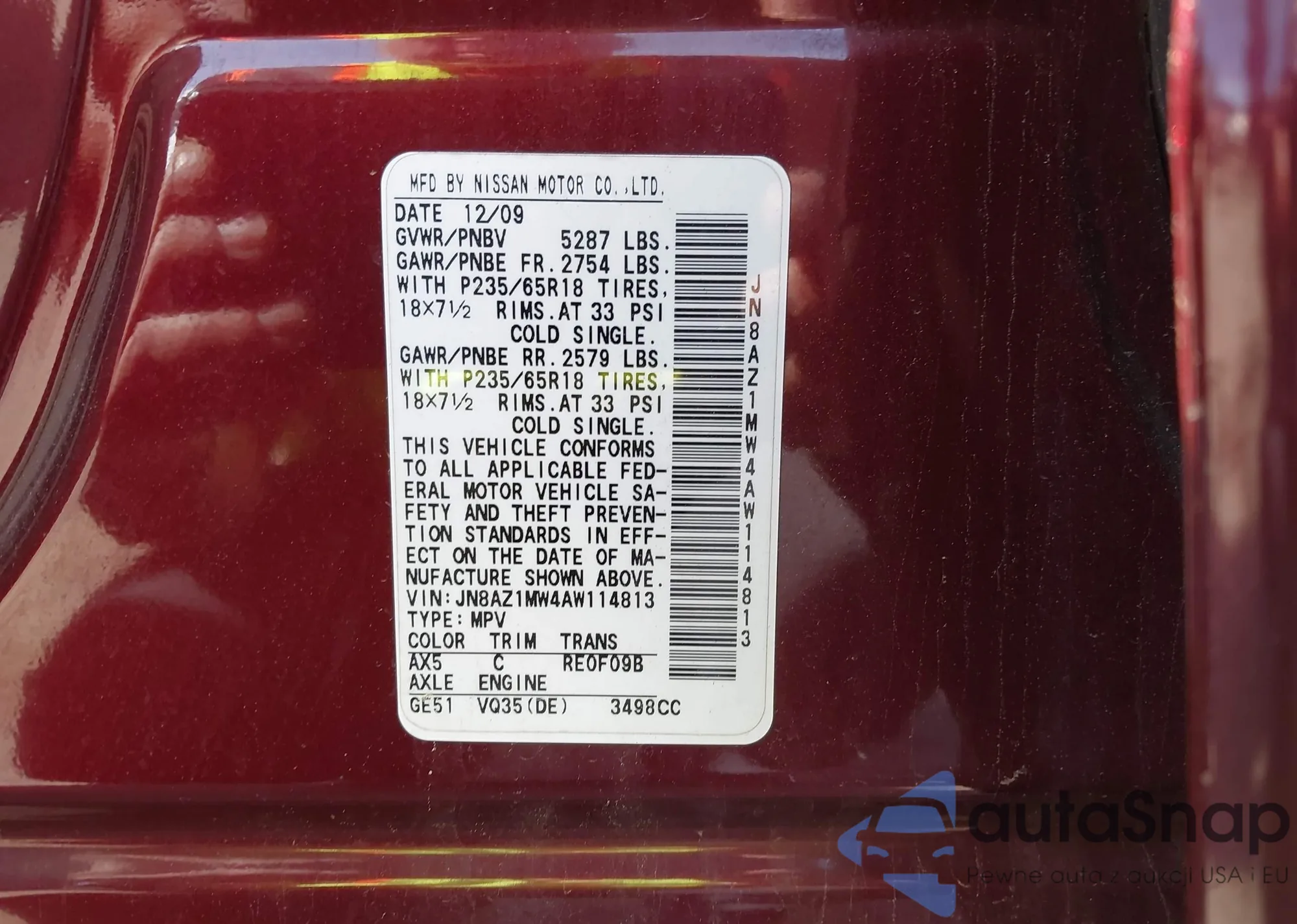 • VIN JN8AZ1MW4AW114813