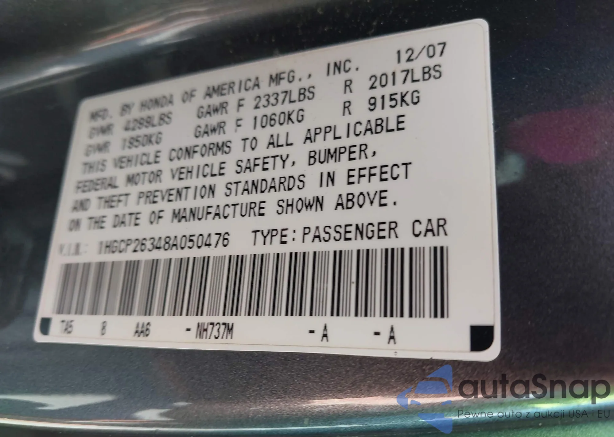 • VIN 1HGCP26348A050476