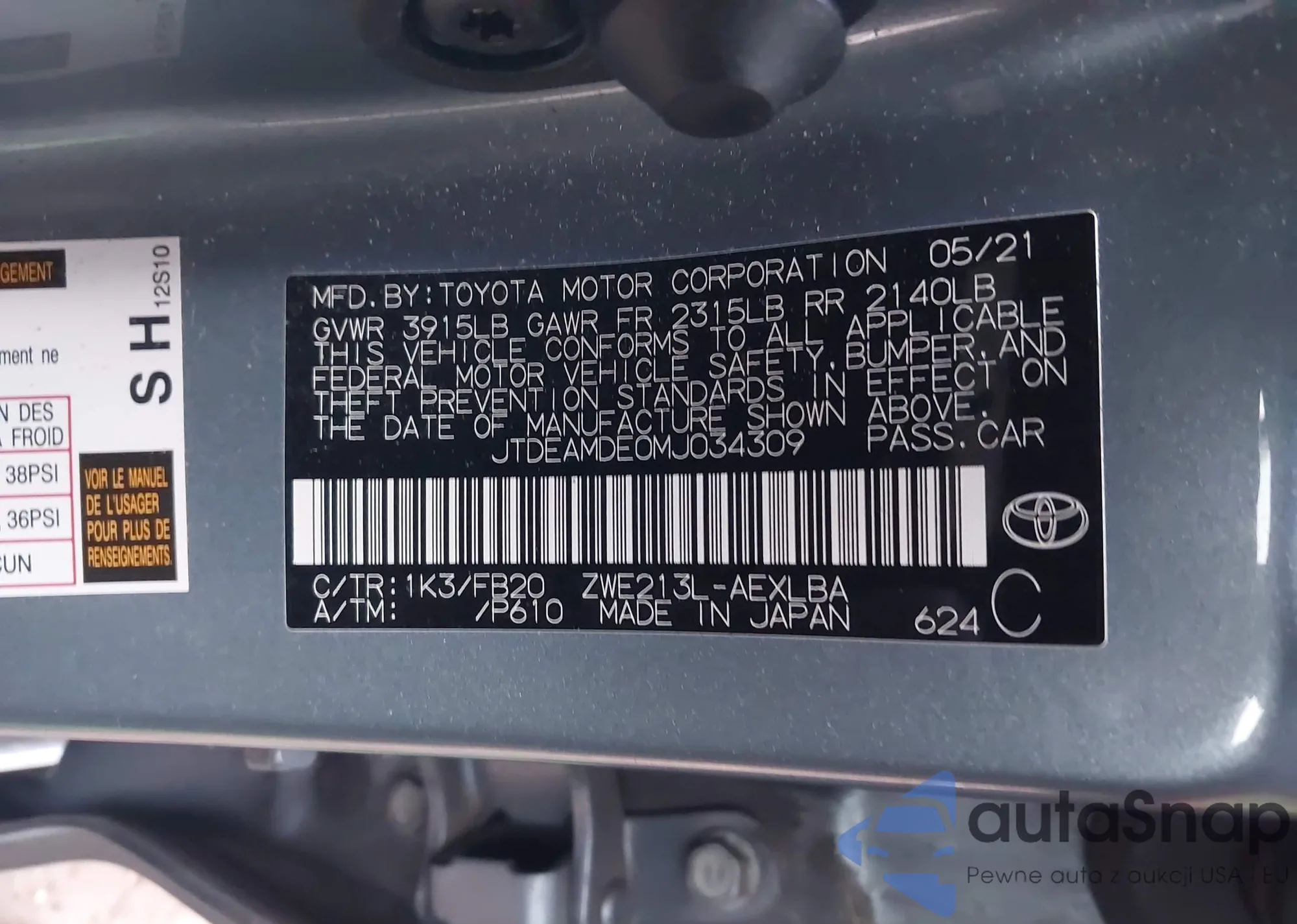LOT: 41548581 VIN: JTDEAMDE0MJ034309