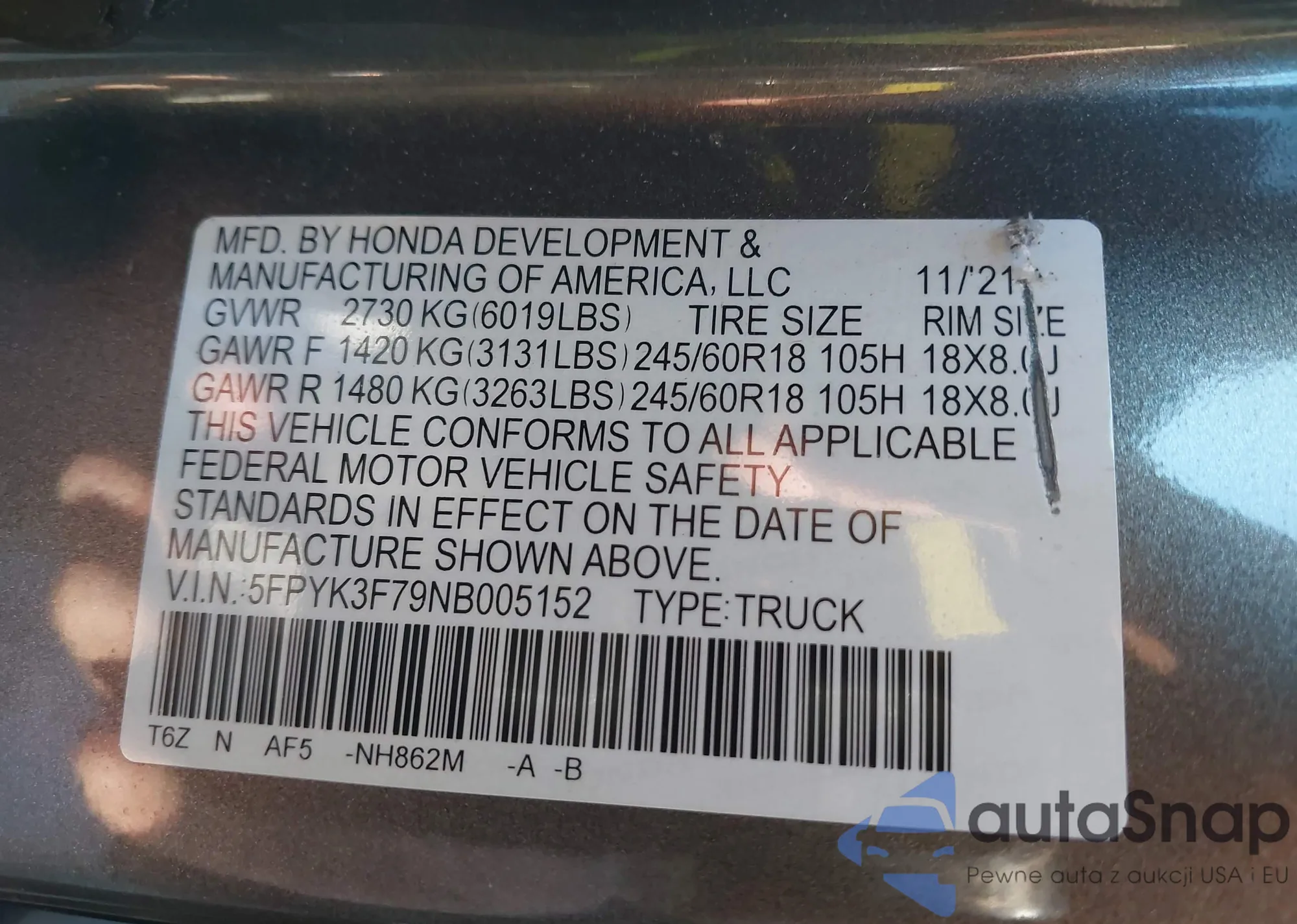 • VIN 5FPYK3F79NB005152