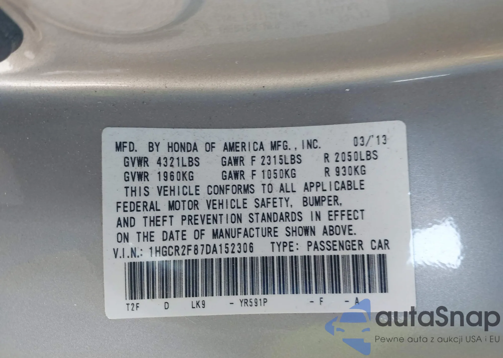 LOT: 42317968 VIN: 5J6YH28368L019548