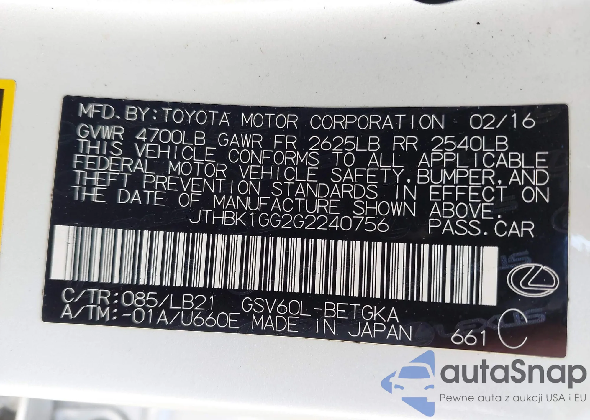 LOT: 42206724 VIN: JTHBK1GG2G2240756
