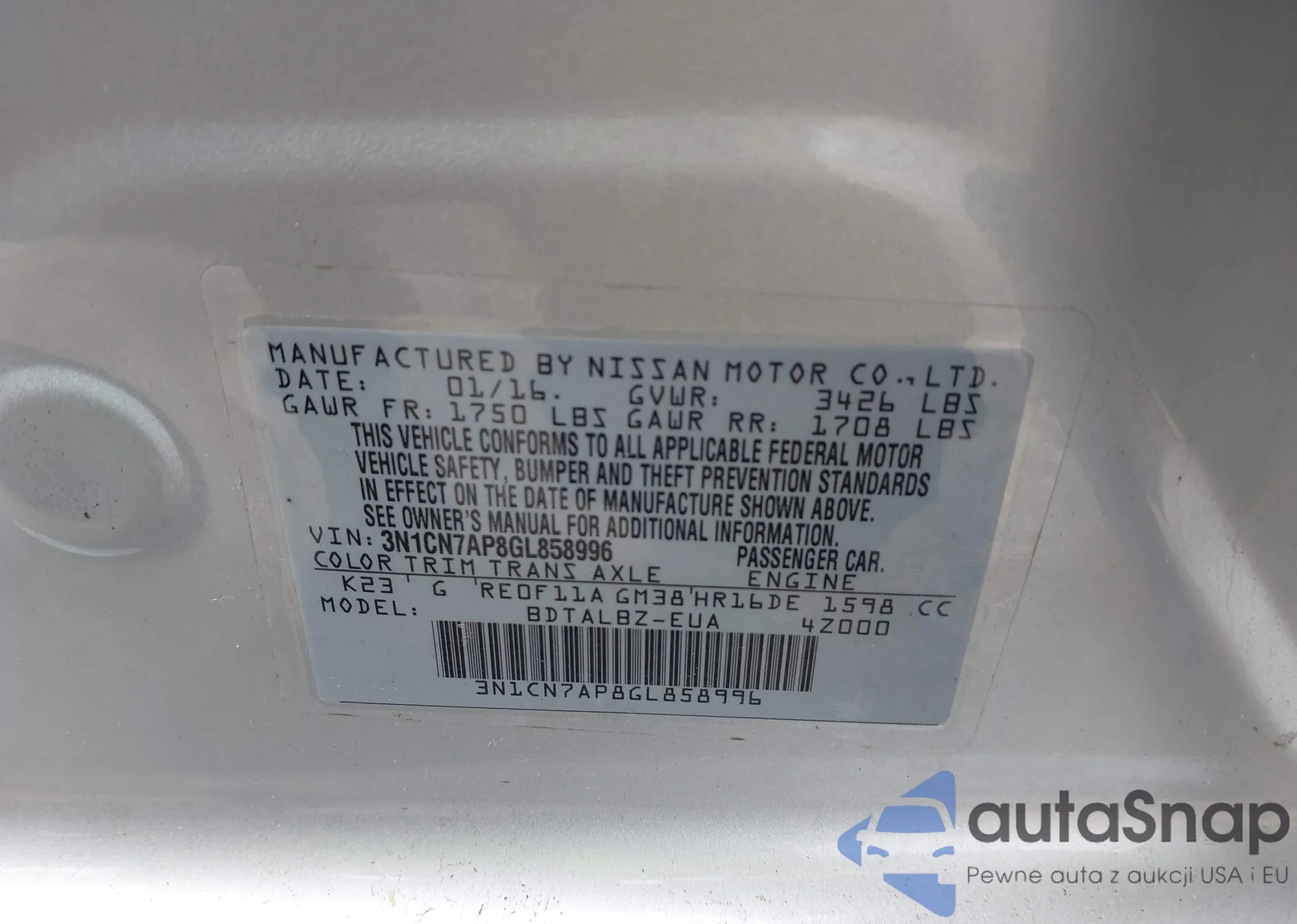 LOT: 42504126 VIN: 3N1AB8CV2RY332015