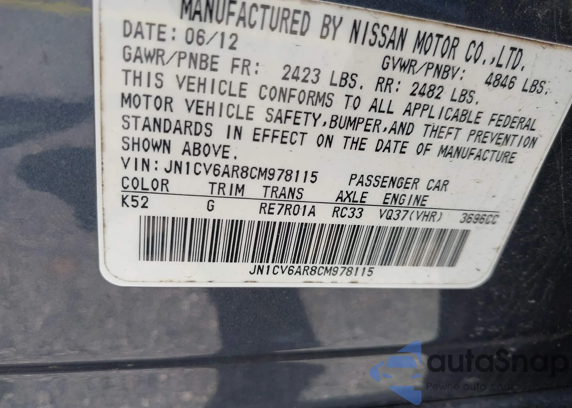 LOT: 42449595 VIN: JN1CV6AR8CM978115