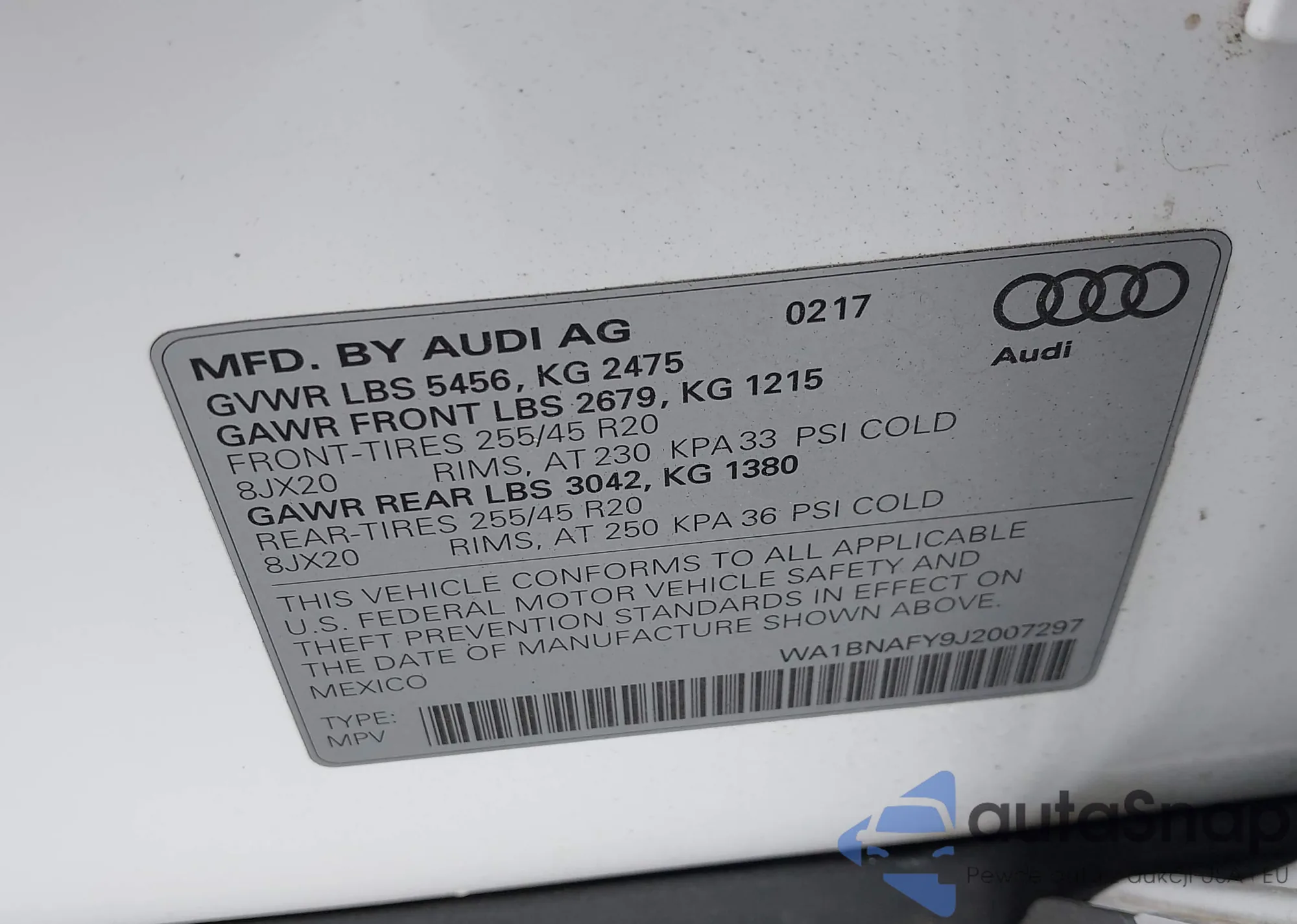 LOT: 42342236 VIN: WA1BNAFY9J2007297