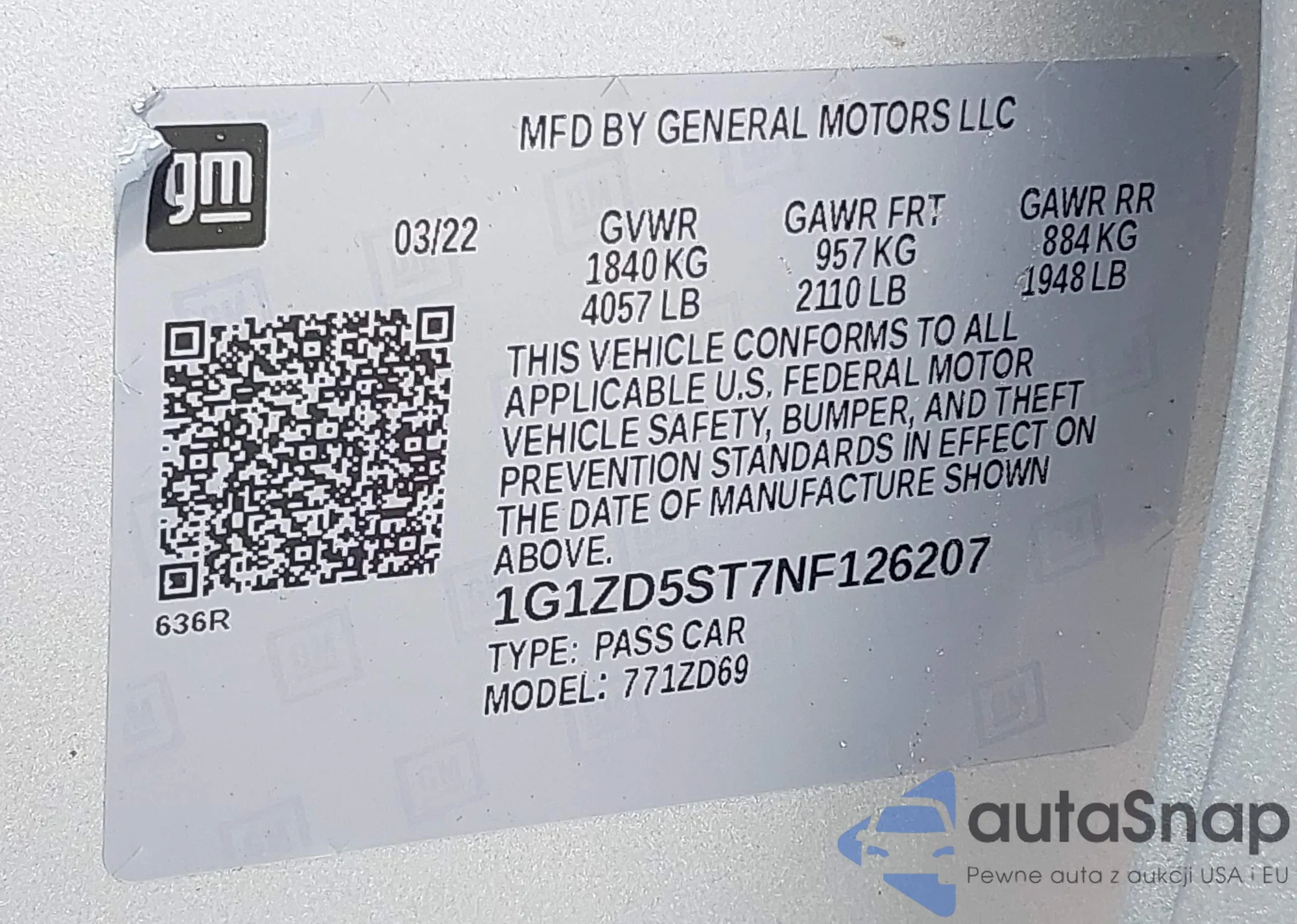 LOT: 42436427 VIN: 1G1ZD5ST7NF126207