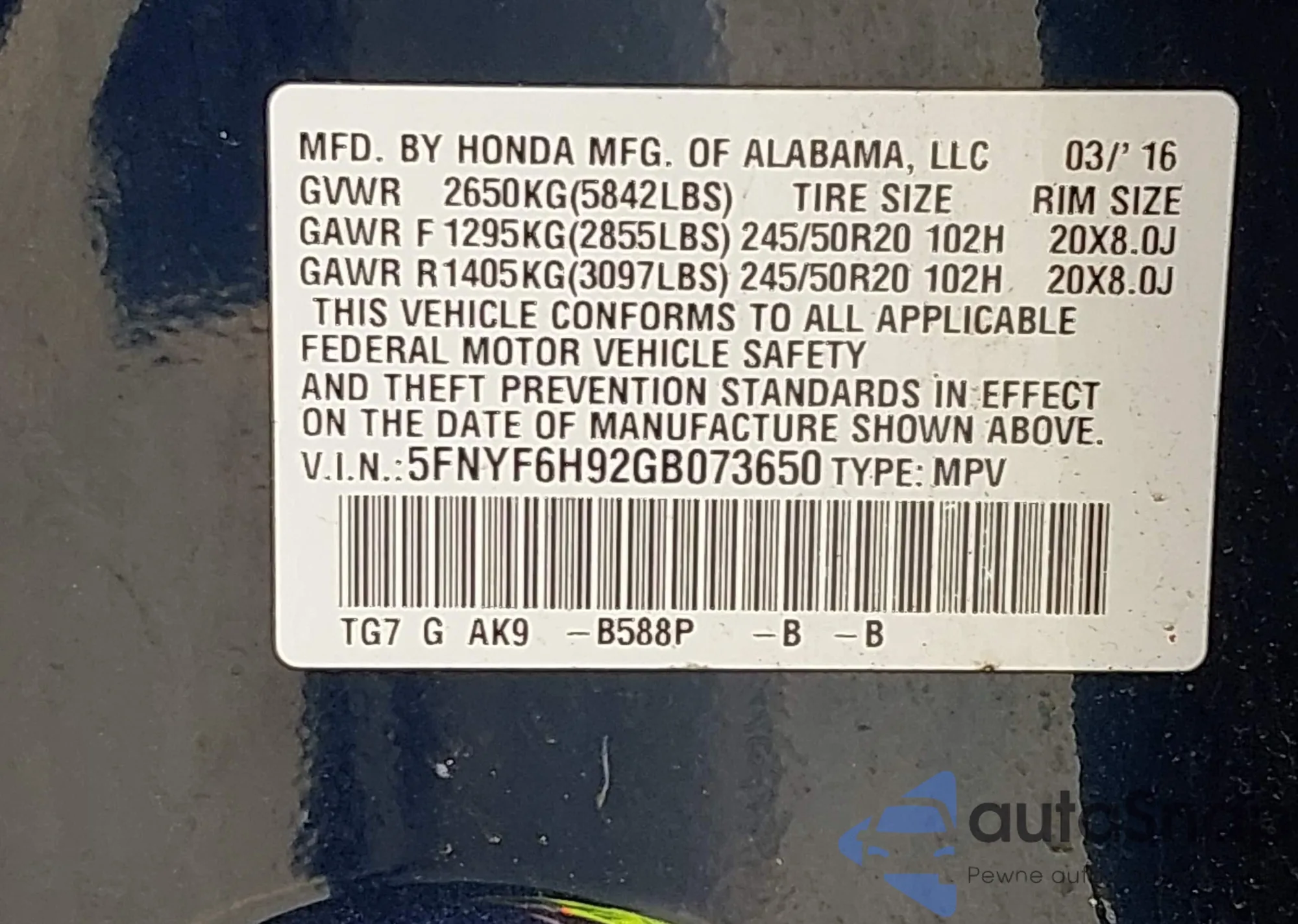 • VIN 5FNYF6H92GB073650