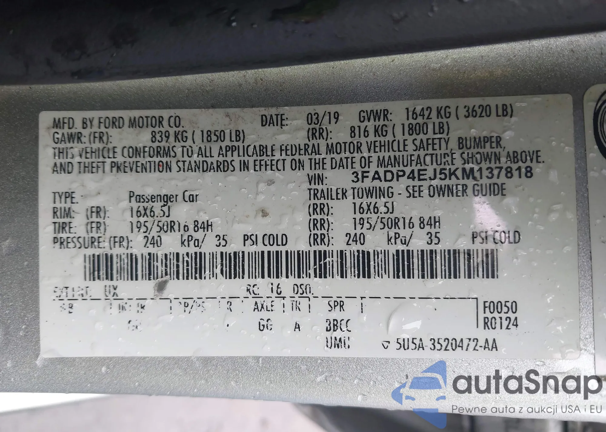 • VIN 3FA6P0HD5KR280844