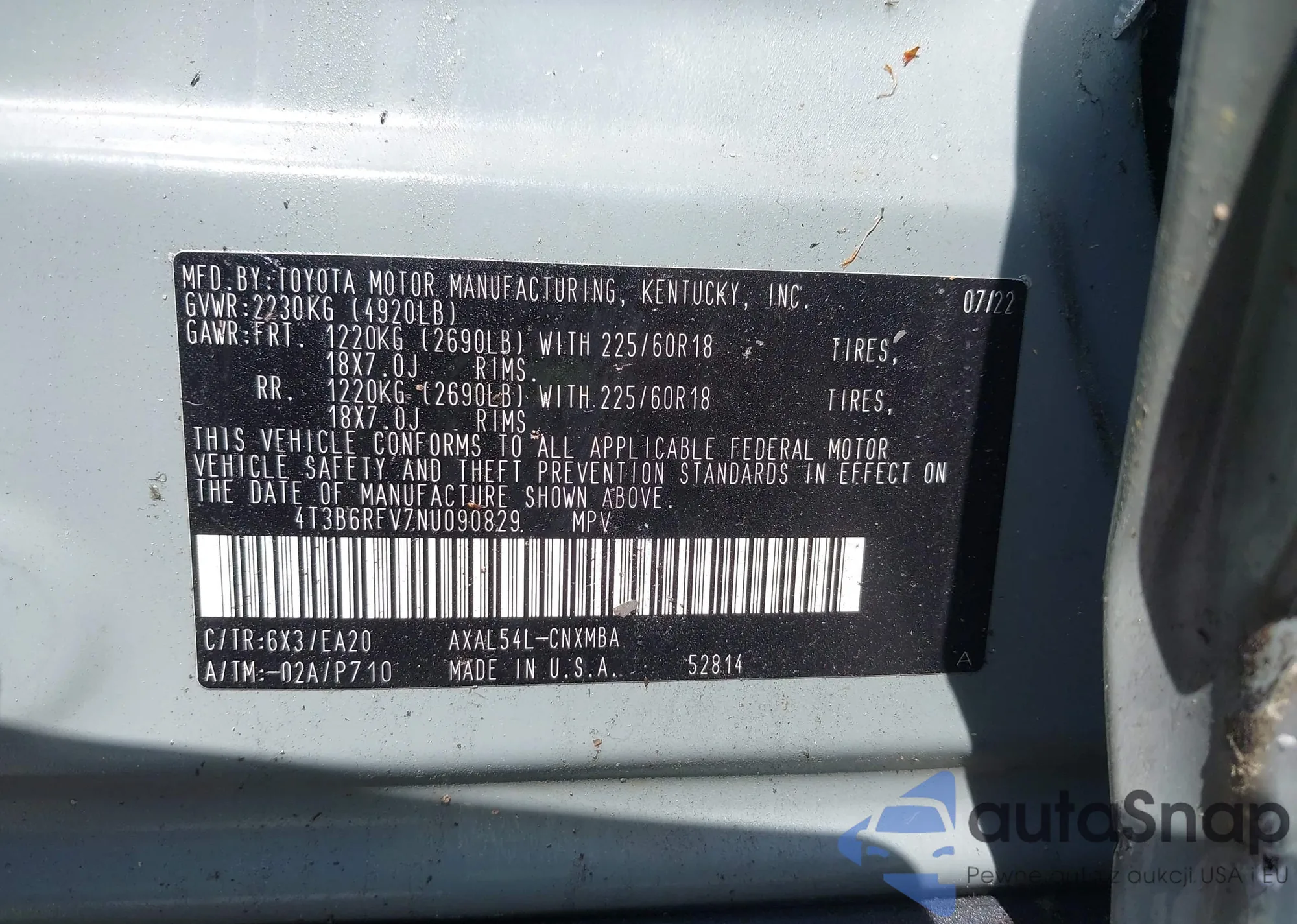 LOT: 42051358 VIN: 4T3B6RFV7NU090829