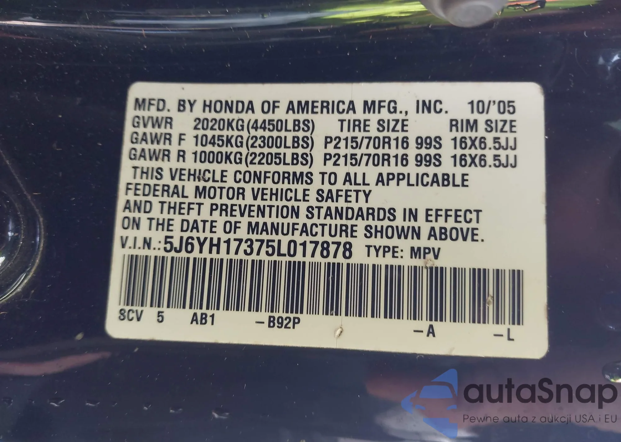 • VIN 5J6YH17375L017878