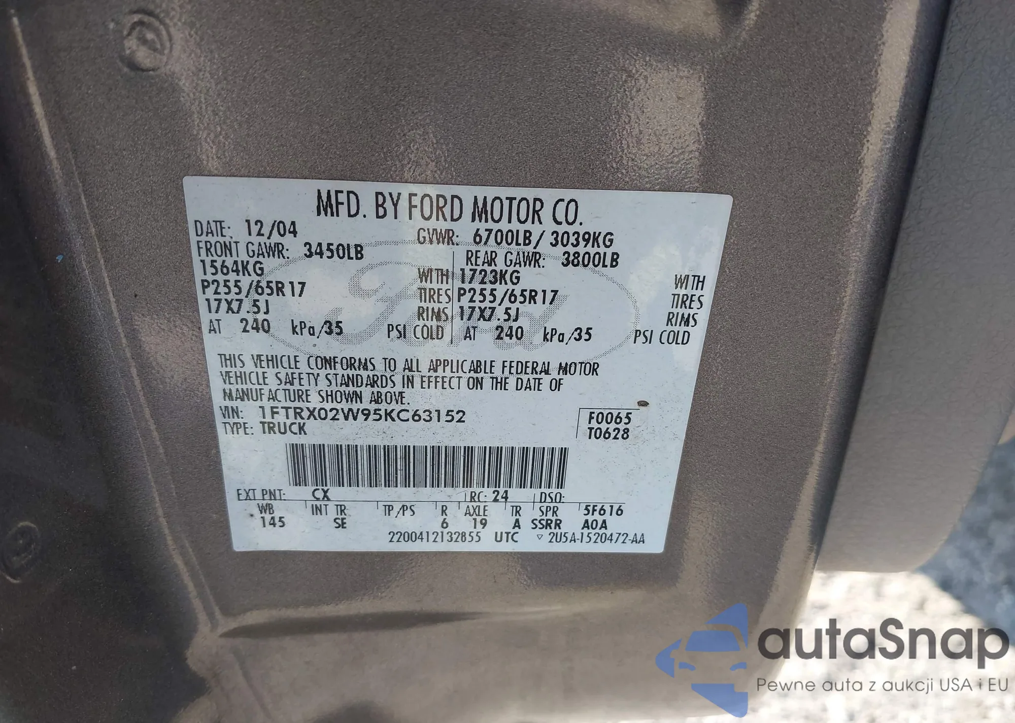 LOT: 42317790 VIN: 1FTRX02W95KC63152