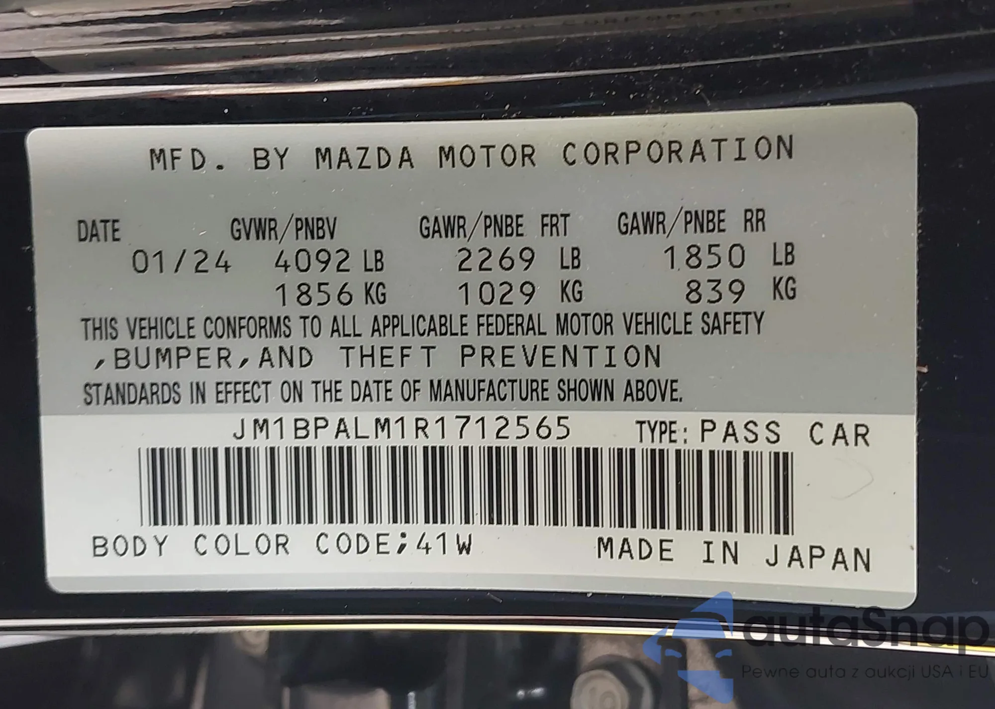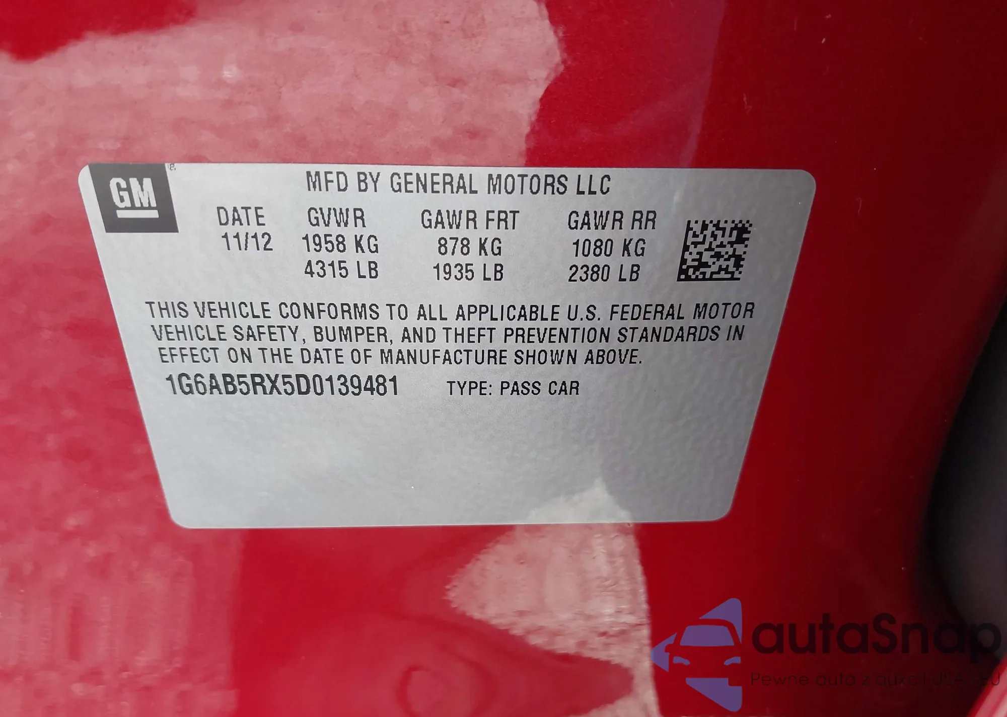 LOT: 42417004 VIN: 1G6AB5RX5D0139481