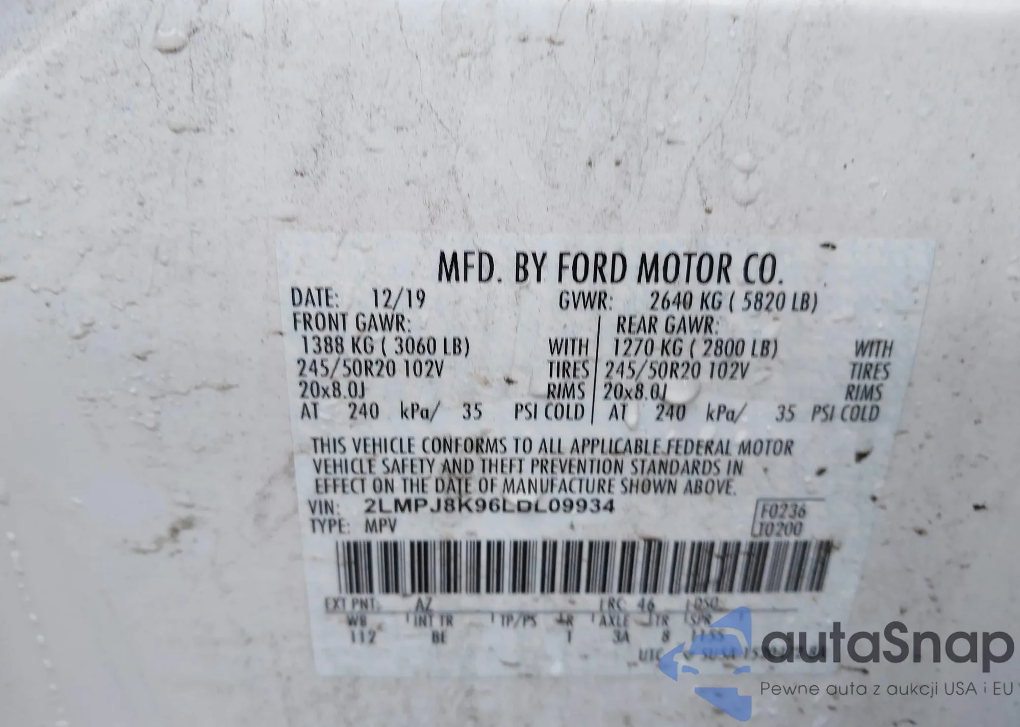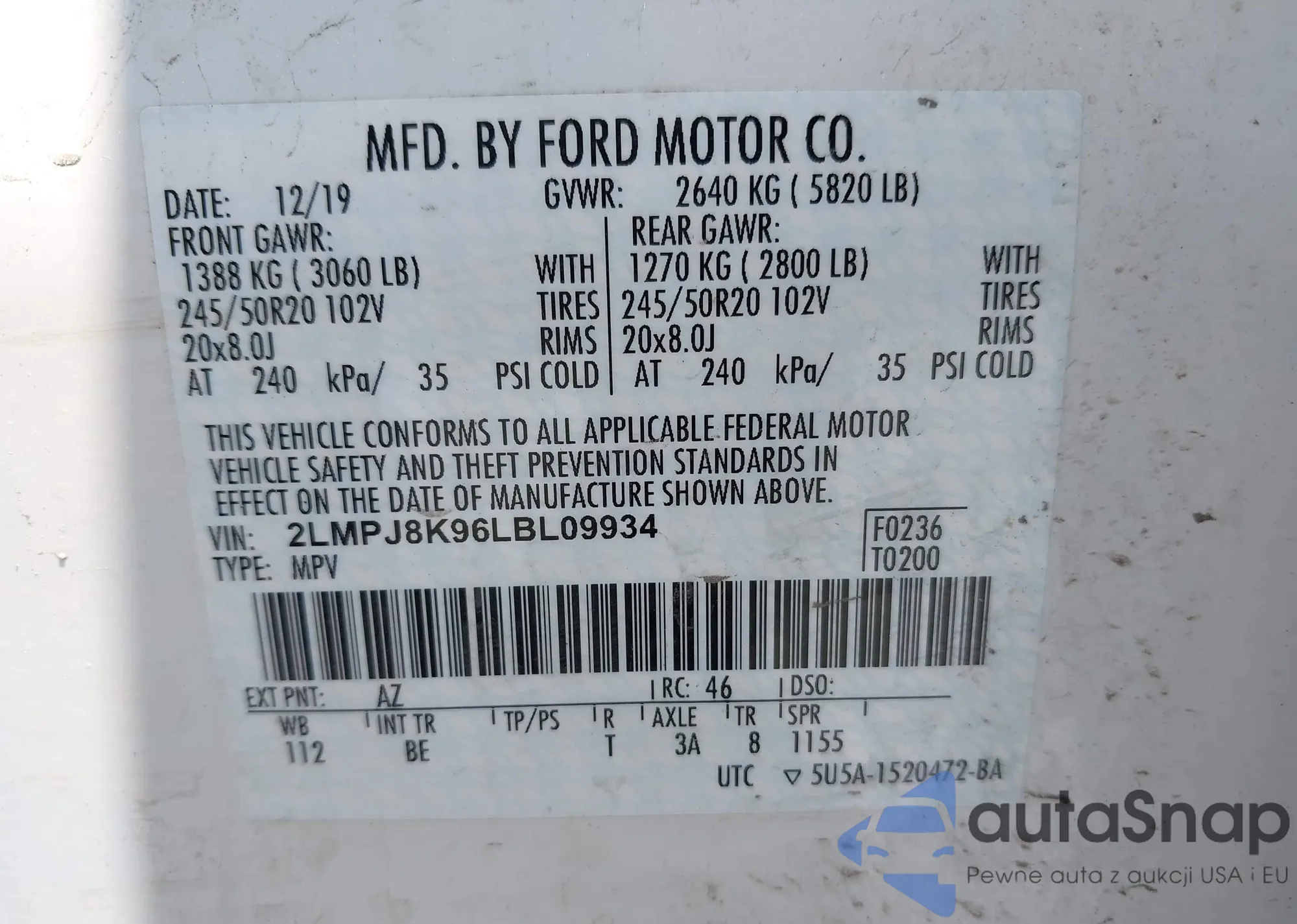 LOT: 41808467 VIN: 2LMPJ8K96LBL09934