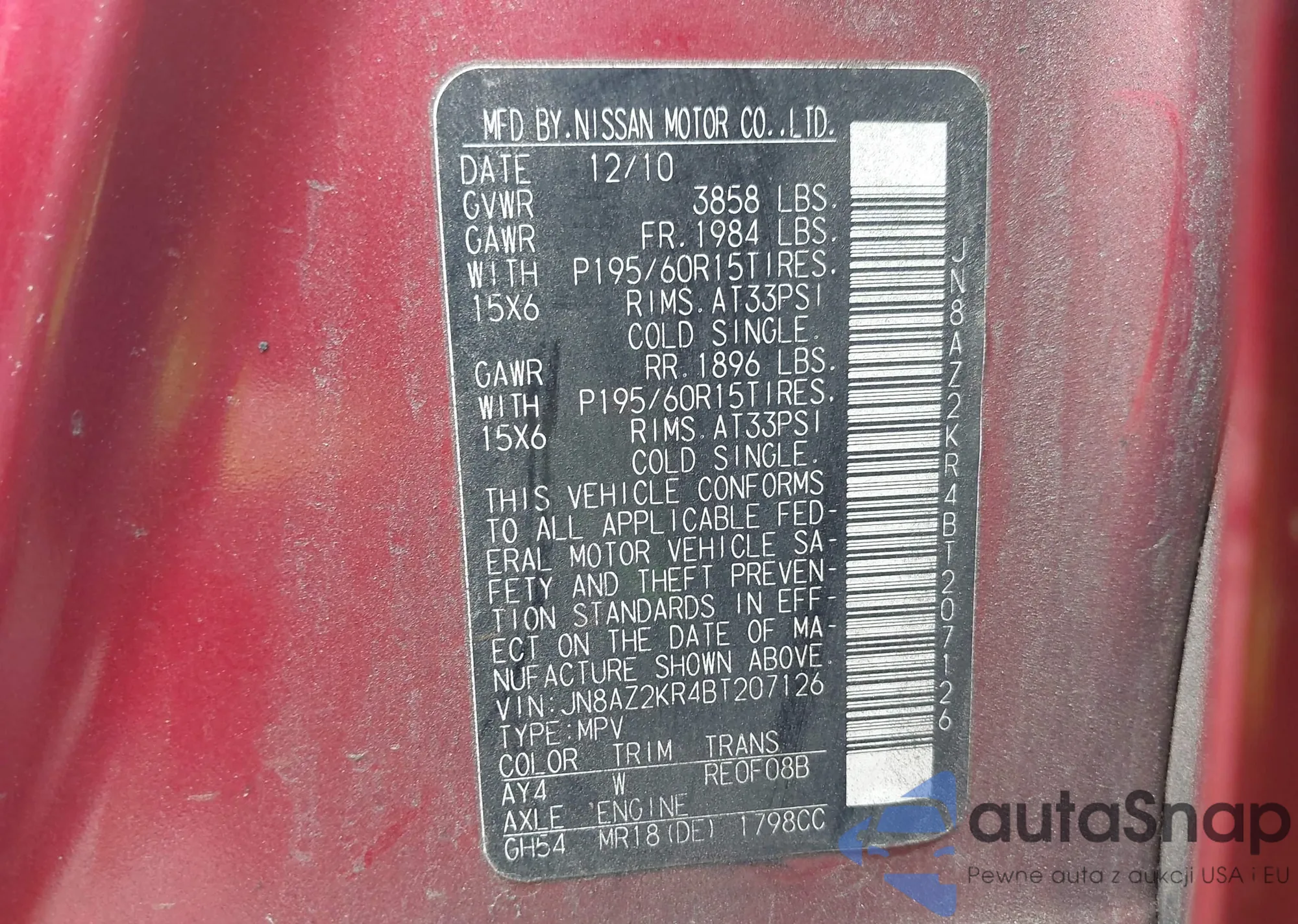 • VIN JN8AZ2KR4BT207126