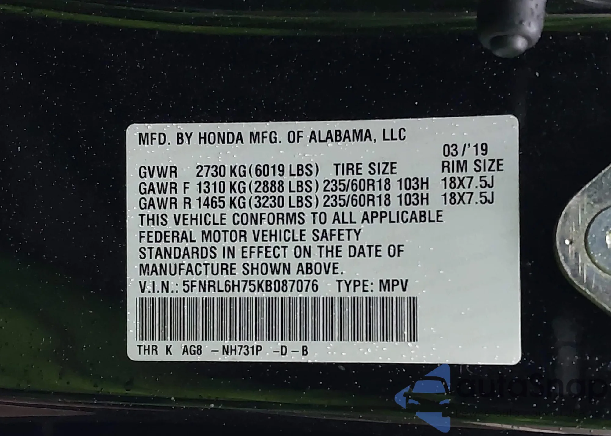 • VIN 5FNRL6H75KB087076