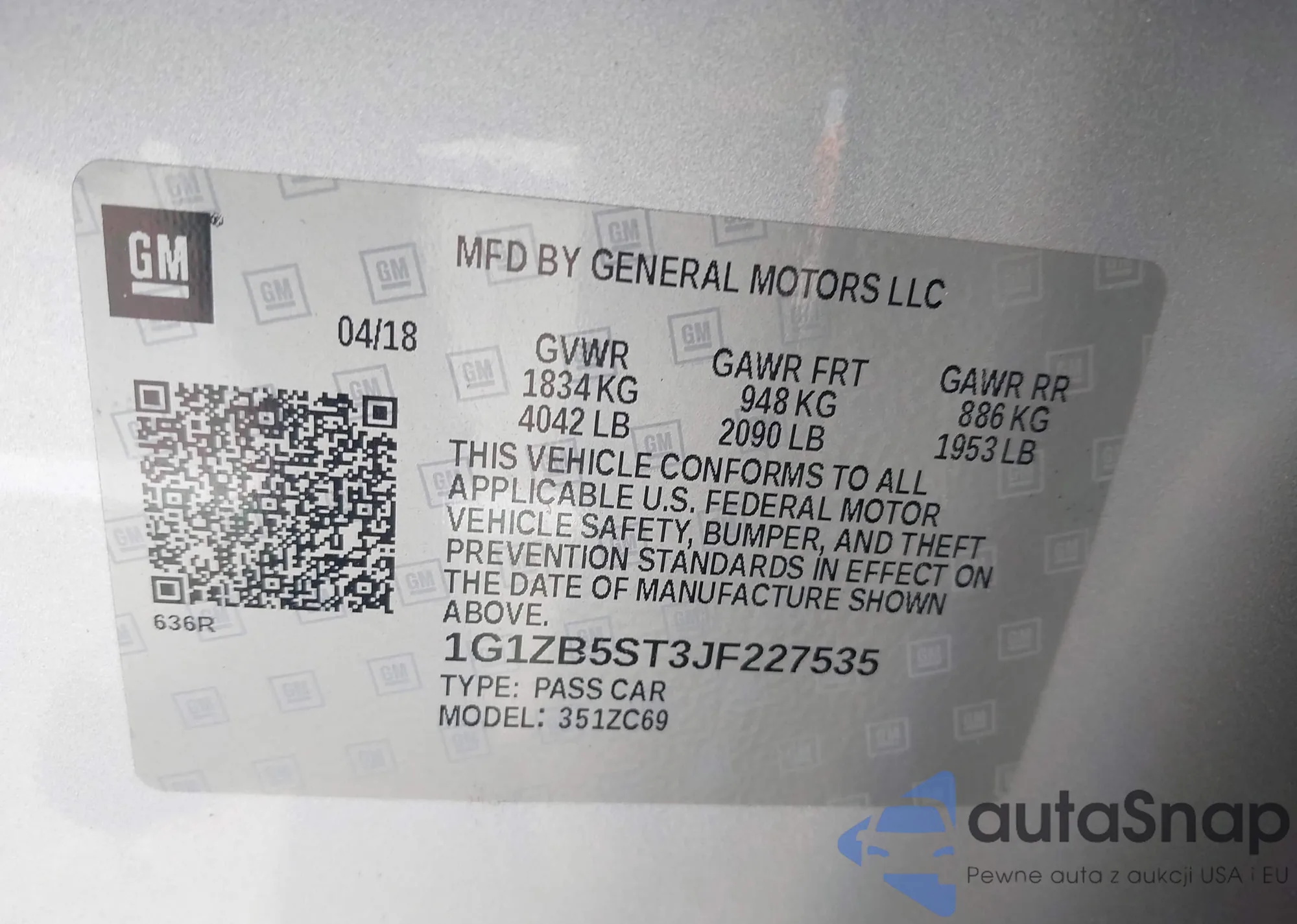 LOT: 42395852 VIN: 1G1ZB5ST3JF227535
