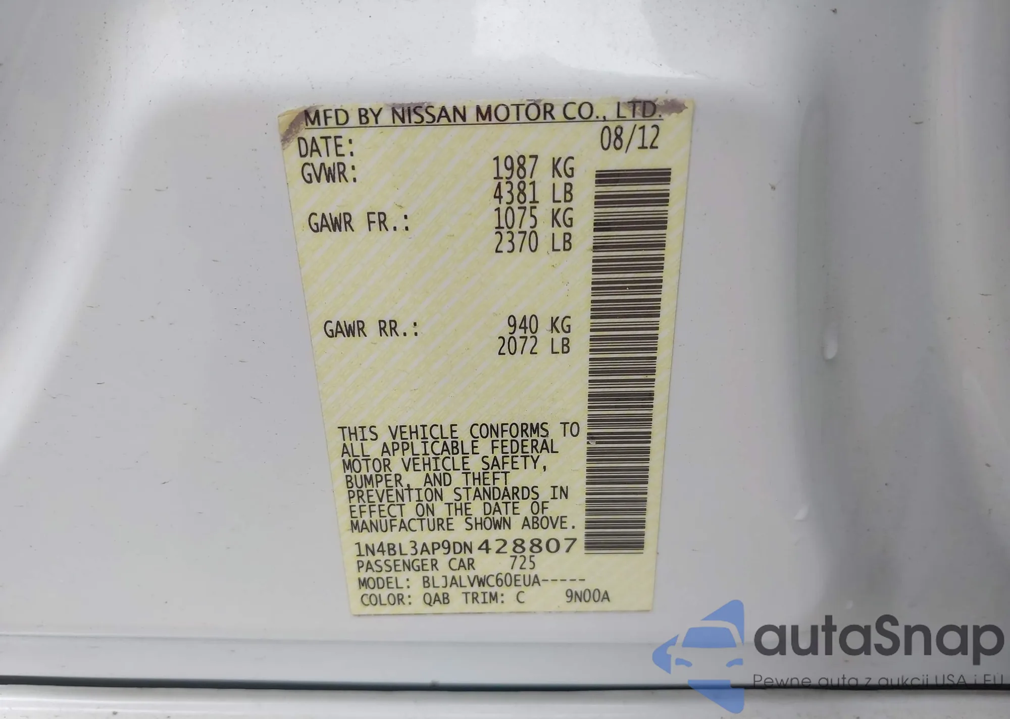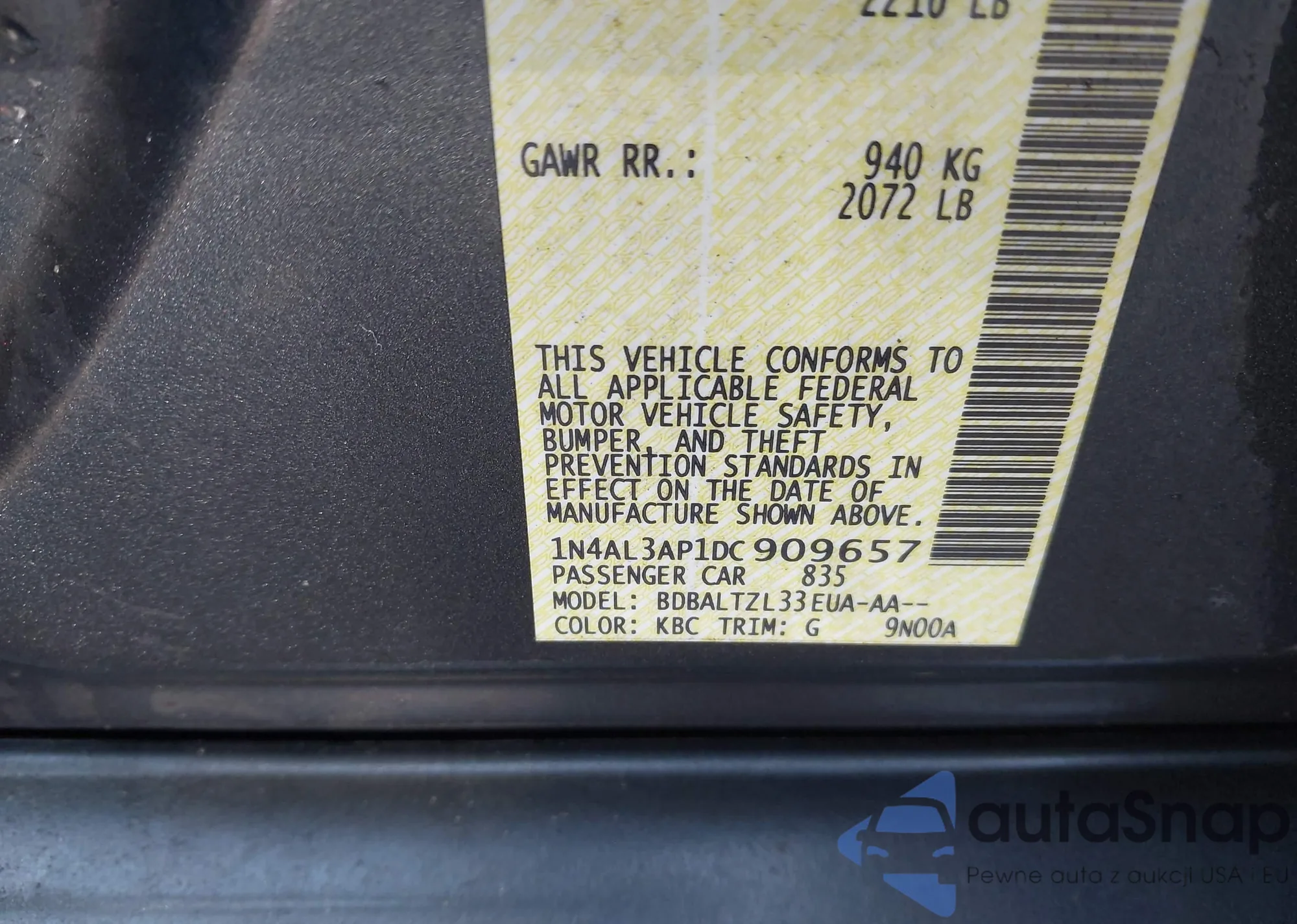 LOT: 42482370 VIN: 1N4BL3AP9DN428807